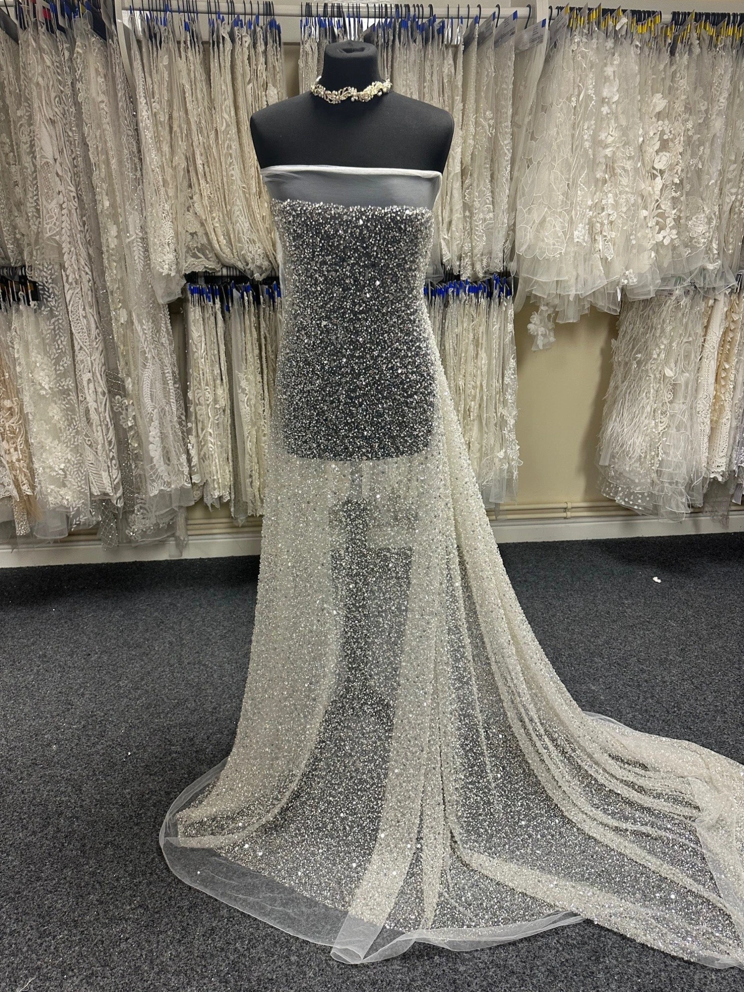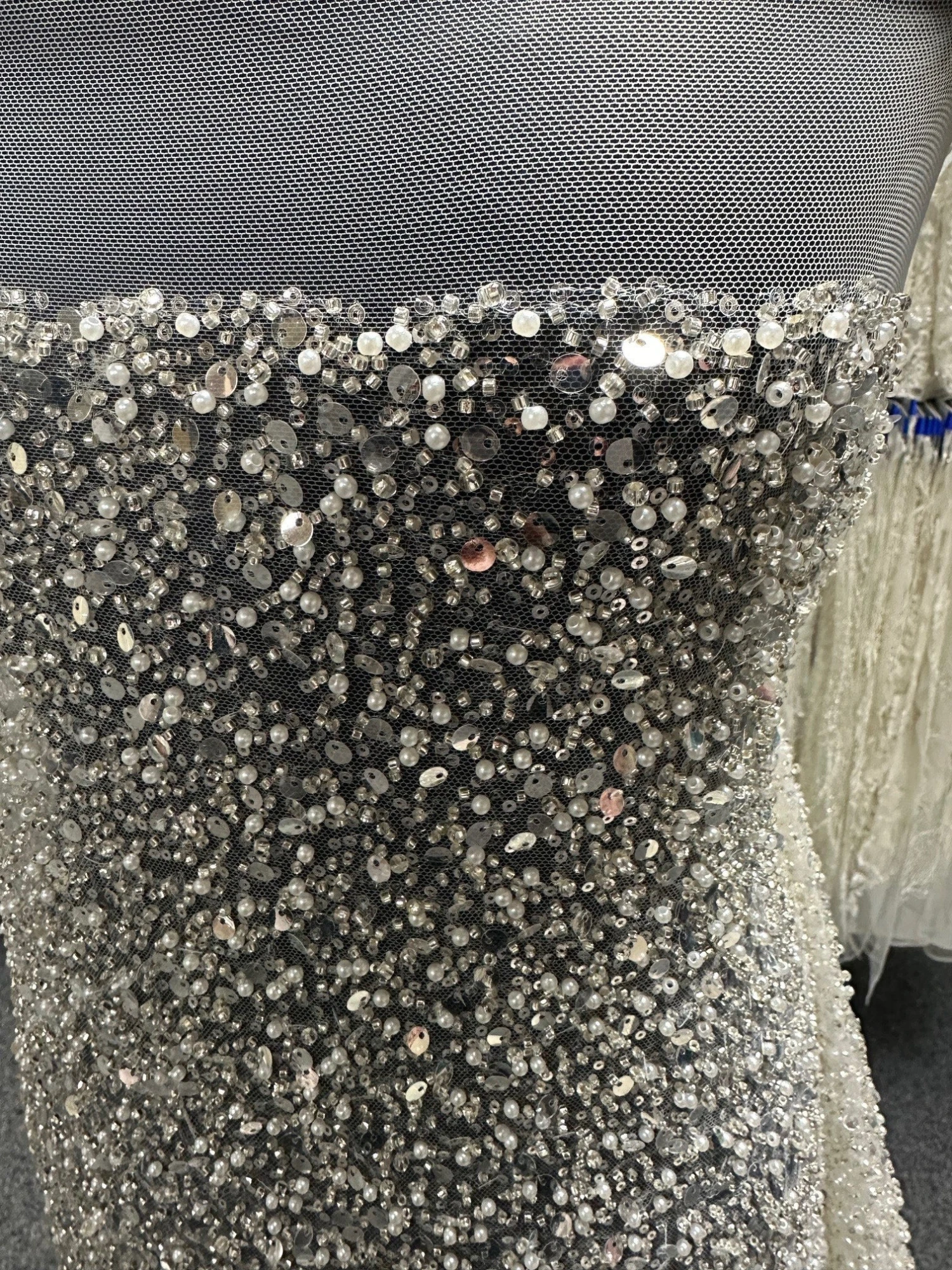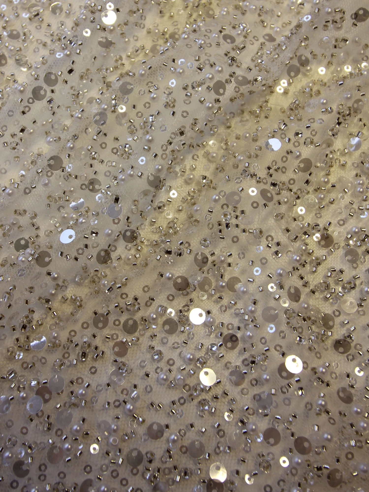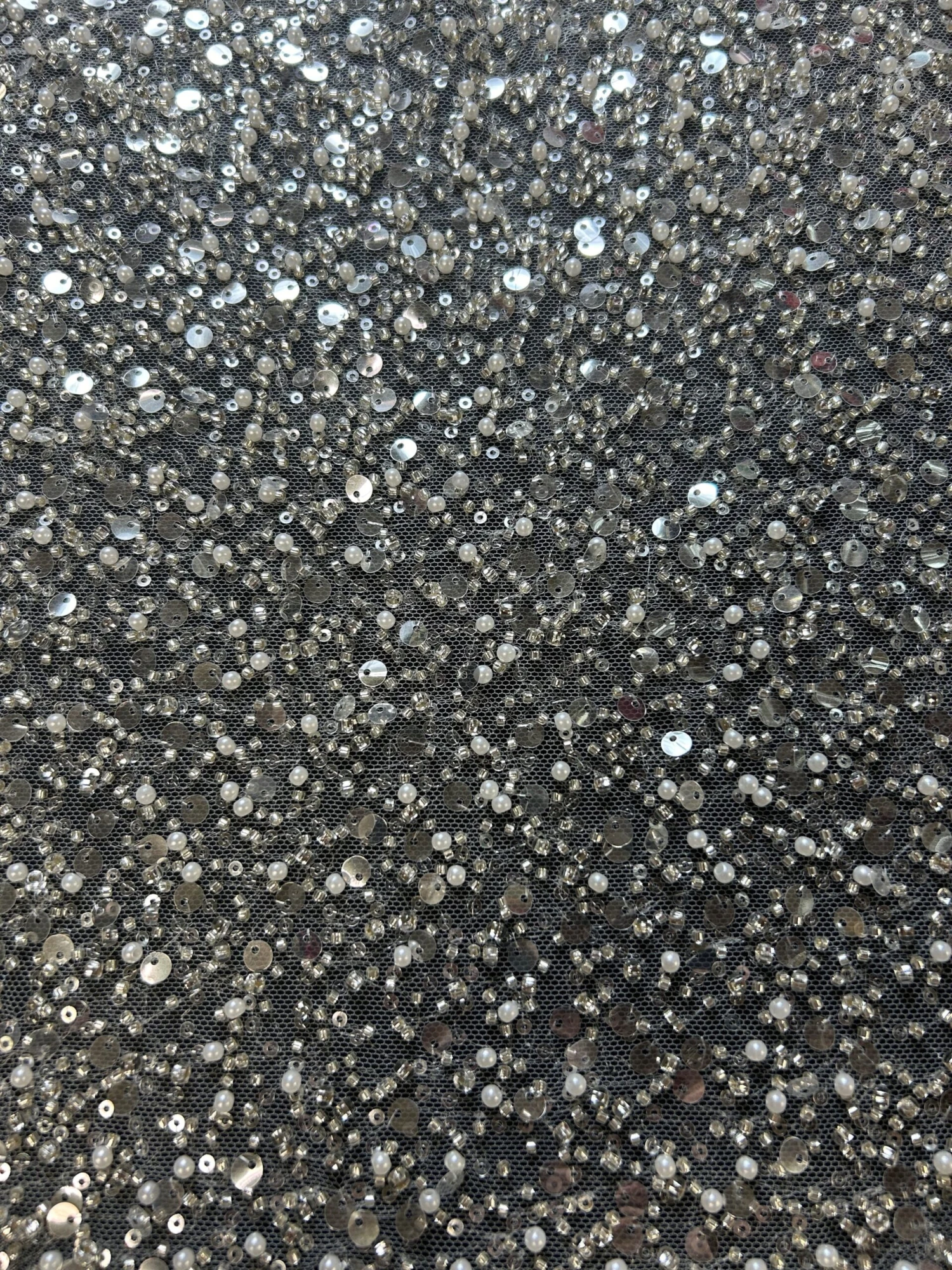 An extravagantly ornate sequinned bridal Tulle , that measures 132 cm (52″) wide. This is a wonderfully sophisticated product with beads, sequins and pearls.