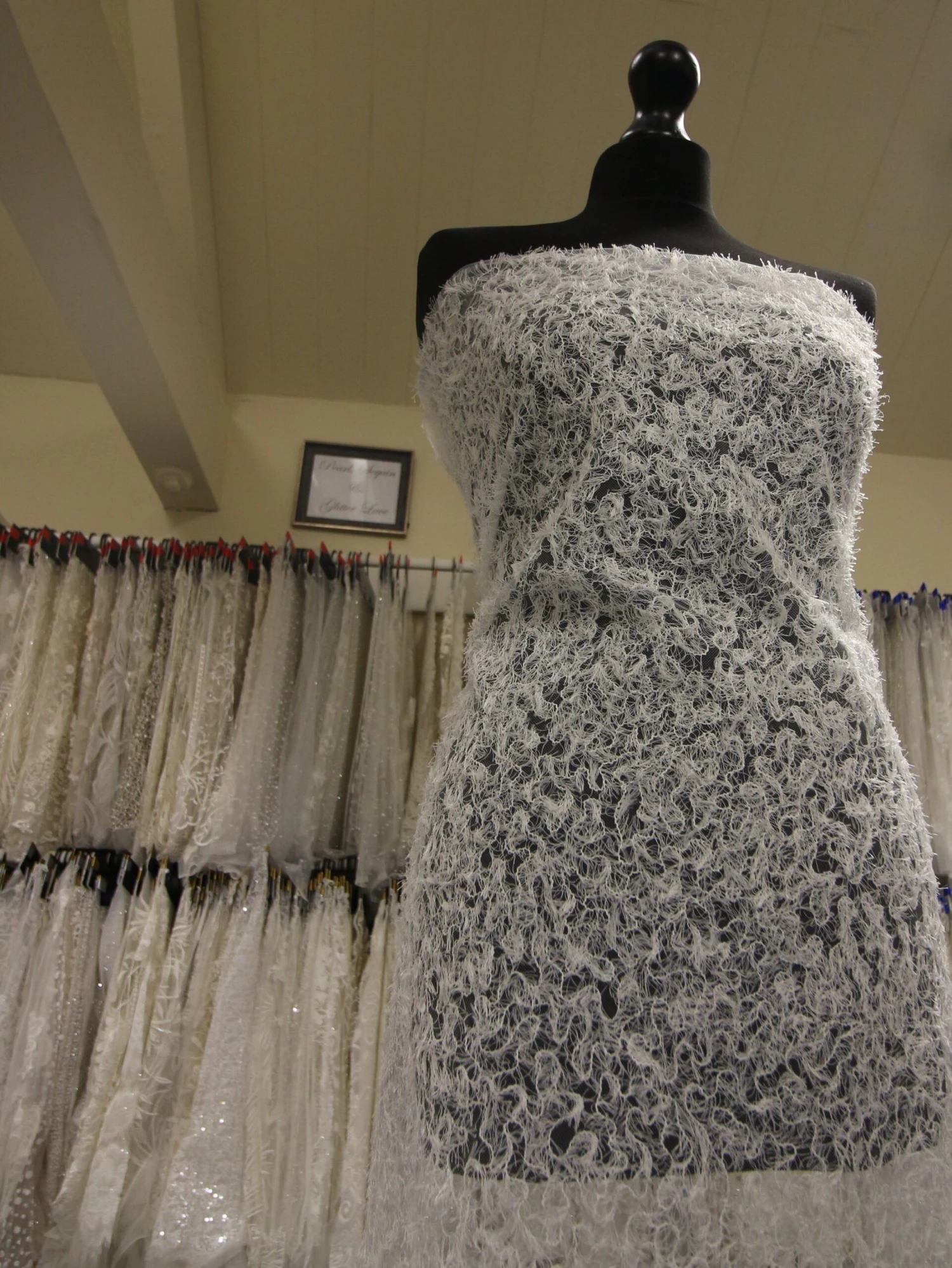 Gina is an Ivory Lace that measures 132 cm (52″) wide. Our designer has taken a soft ivory tulle and embroidered feather like threads into it, so that it appears as if covered in duck down. This is a lovely tactile and soft fabric that you won’t want to stop touching! The all over design repeats across the tulle base without an borders so this is a versatile bridal lace to make s stunning wedding dress with. Order your free sample today!