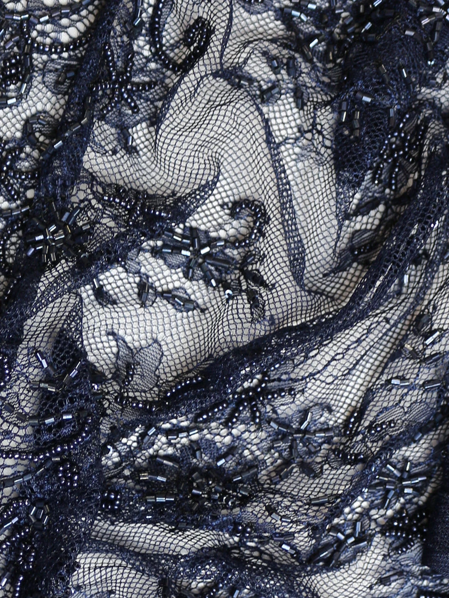 Daring and dramatic, this striking navy lace is a superior addition to our range of coloured laces. Embellished with subtle beading to give it some sparkle, and with a scalloped, fringed edge this racy lace really is for the audacious client who wants to command attention. This is a navy lace measures 132cms (52″) wide. Full pieces are 3 metres so orders in excess of this quantity will be supplied in more than one piece.