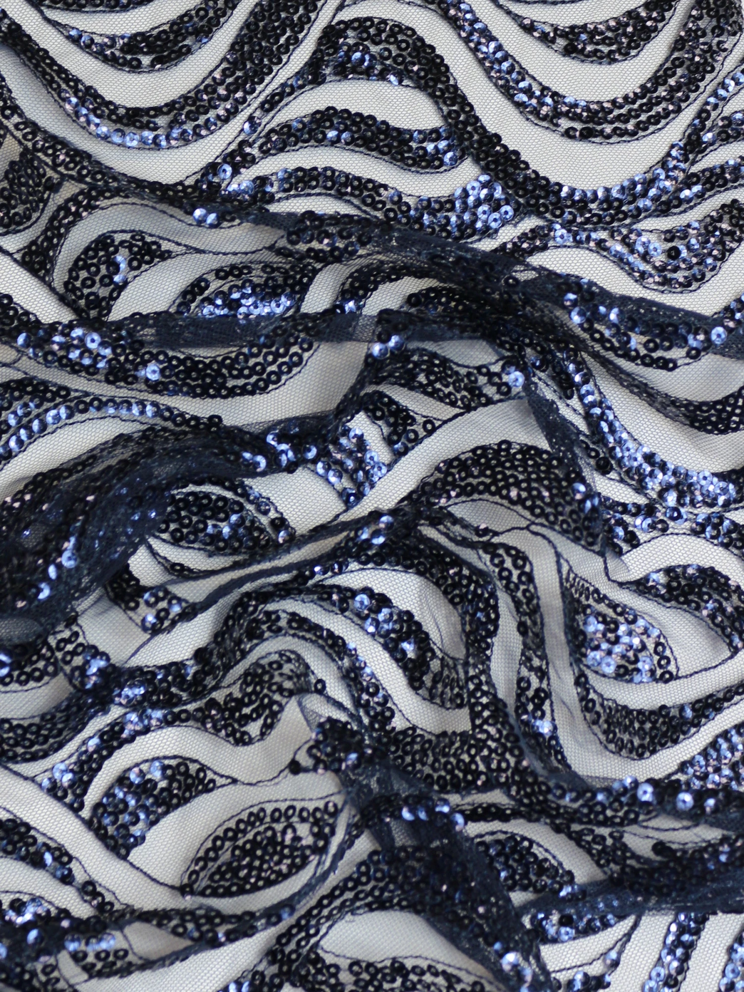 A shimmering navy sequined lace on a navy tulle background that is perfect for evening wear or mother of the bride, which measures 132 cm (52″) from edge to edge.