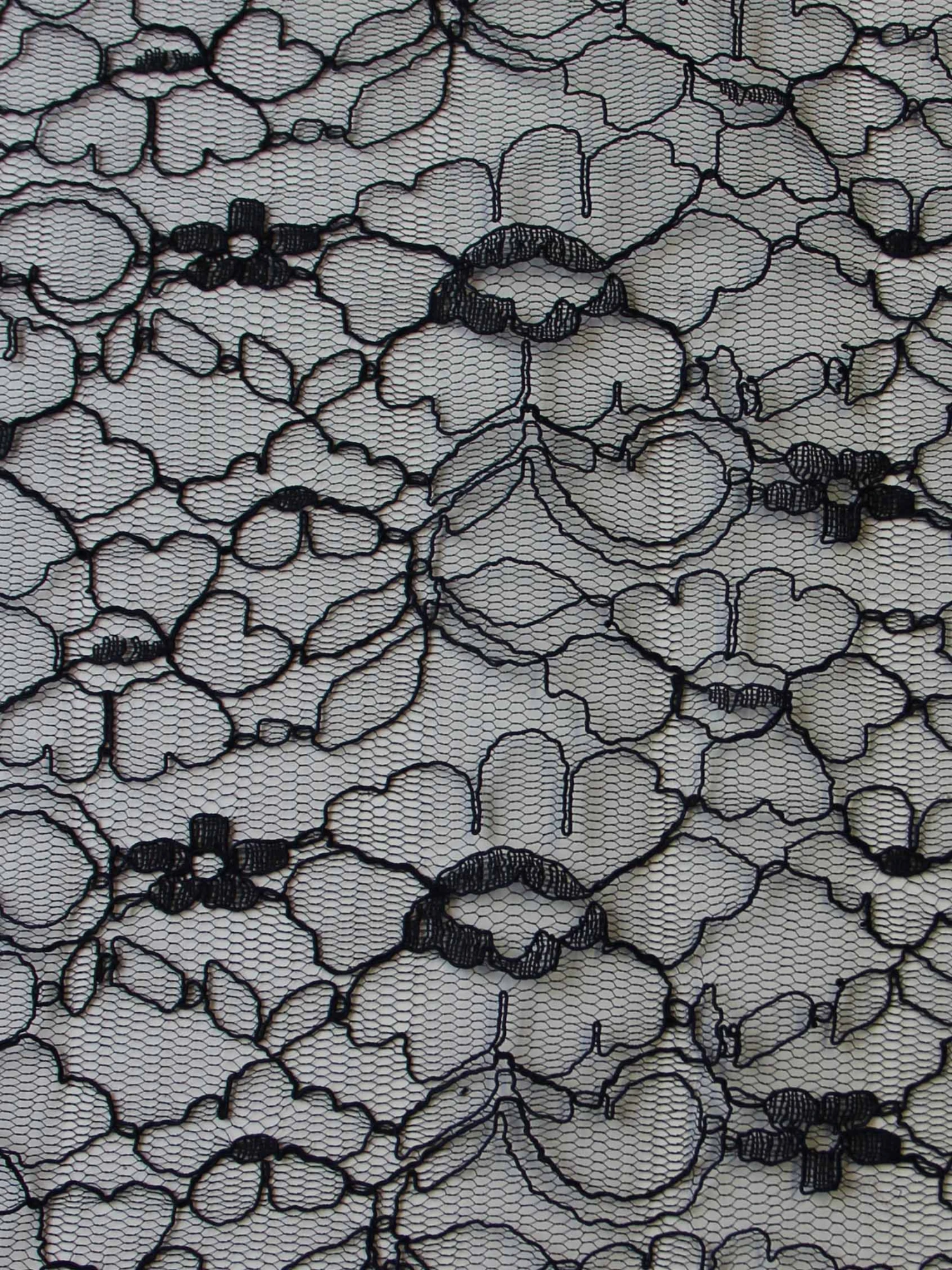 One of the edges is scalloped whilst the other has a straight edge. The woven background is a open tulle, with small areas of shaded flowers. A cording runs throughout the design to form an interlocking floral design.