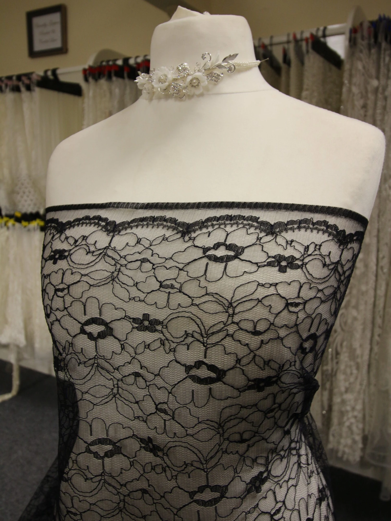 Very classy and perfect for “Mother of the Bride” or Prom attire, this lace could be used either in the dress or as part of the veil. The composition is 66% Nylon & 34% Rayon.