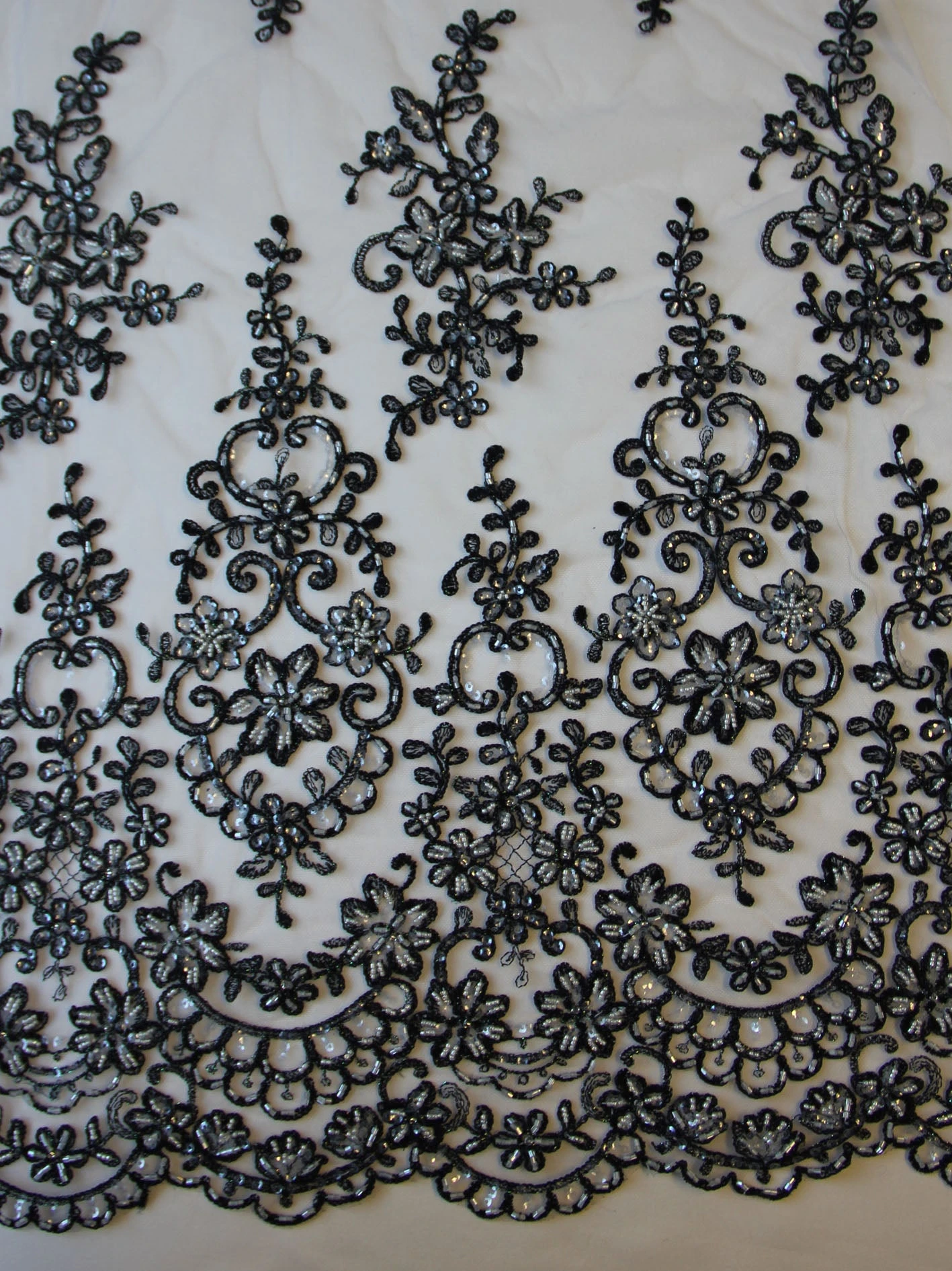 A rich navy Lace in the same base design as Alexandra Bridal Lace . It is a heavily beaded and corded Border Lace on a fine tulle ground. The floral motifs are finely corded with sequins, beads and diamantes.