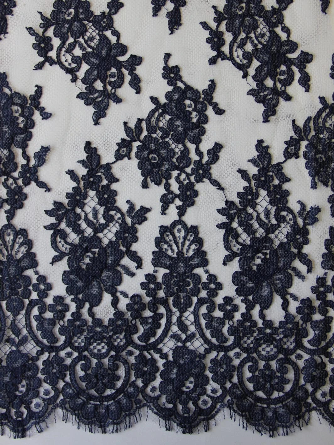 A delightful Navy Blue Chantilly French Lace with symmetrical borders and floral motifs fairly closely spaced throughout the body of the pattern. The motifs are lightly corded and measure 12.5 cm (5″) tall. The edges of the lace are gently scalloped with a pattern repeat of 8 cm (3″).