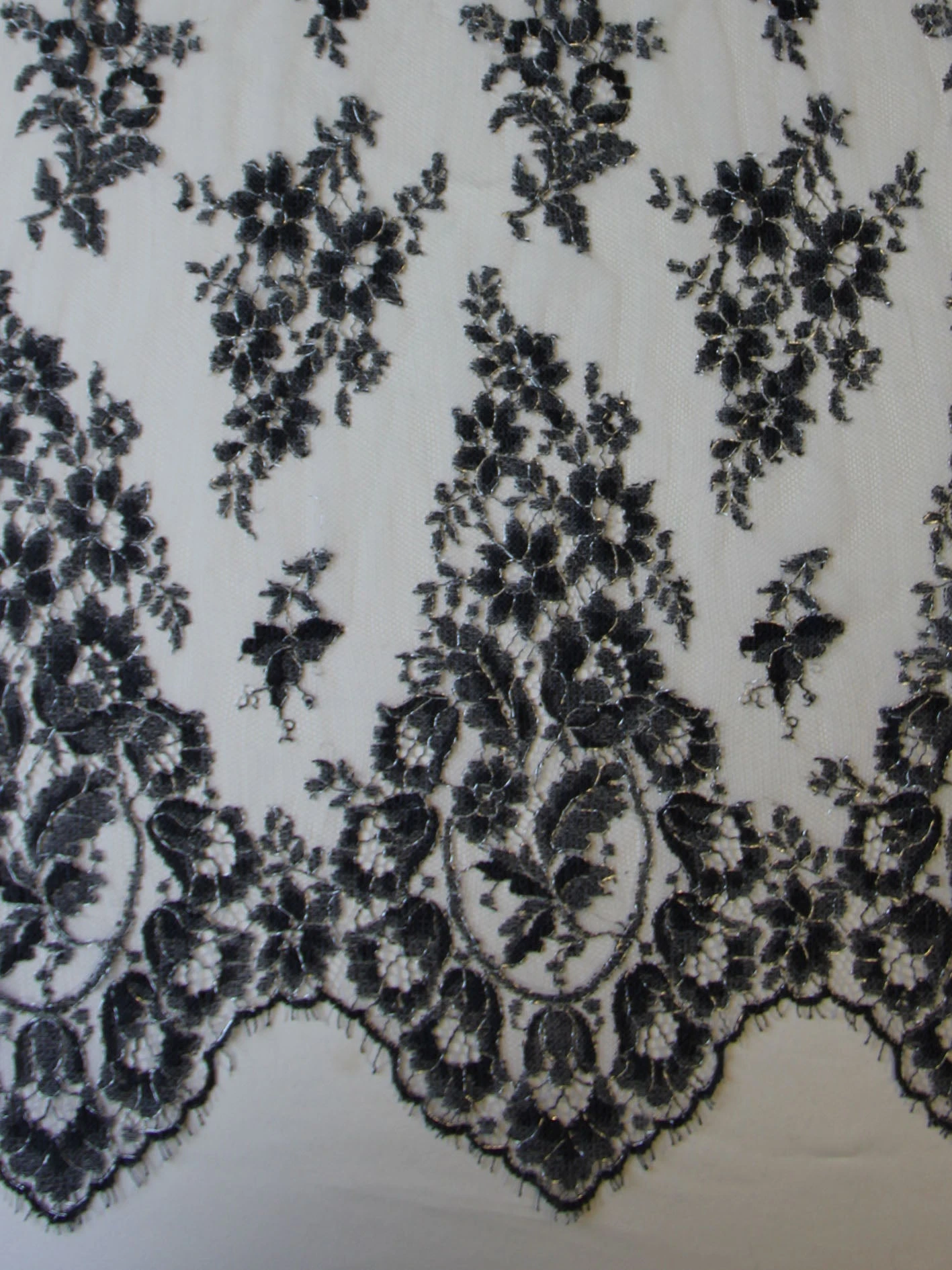 Wendy is an delicate lace that measures 109 cm (43″) wide and features delicate shading throughout to form a very feminine floral effect. There is a soft subtle silver thread that runs through the motifs in the lace.