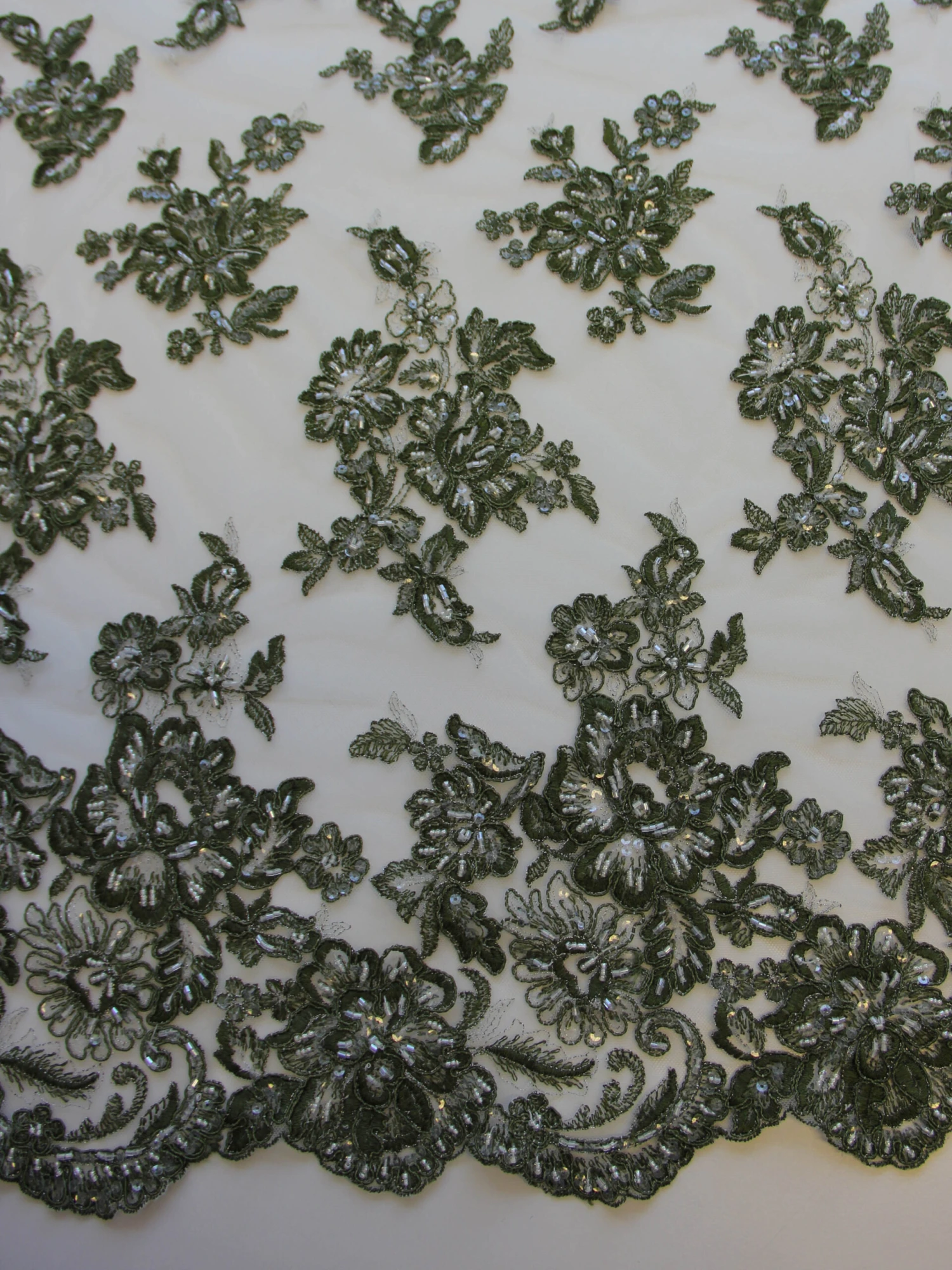 A luxurious olive Green lace which has three different Floral Motifs in the ground of this extremely elaborate design. The three motifs contain a single flower motif, a 2 flower motif and a 4 flower motif. The flowers are corded and feature an embroidered ground with sequins and beads being used to great effect. A single silver filigree thread is used to edge buds and stems.