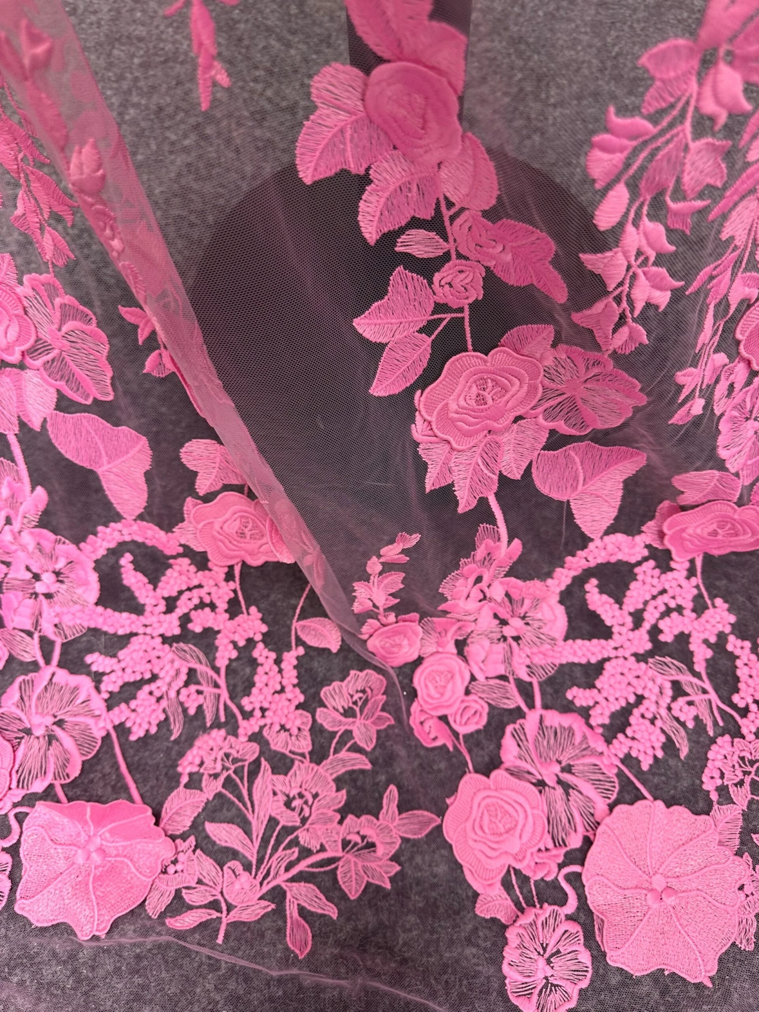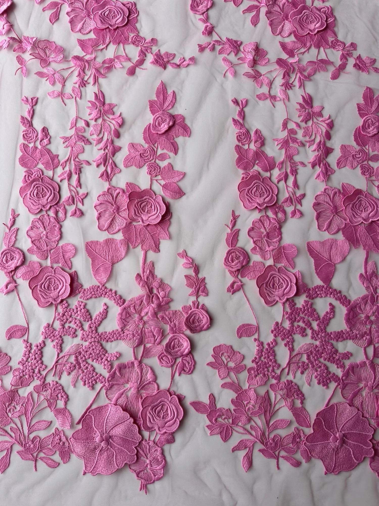 Meghan is a bold and beautiful vivid pink lace that is expressive and harmonious. Travelling up the tulle are bold flower motifs, some of which are 3D appliques, with leaf and smaller floral designs, including buds, flourishing over the tulle base. The pattern repeats on 33 cm (13″).