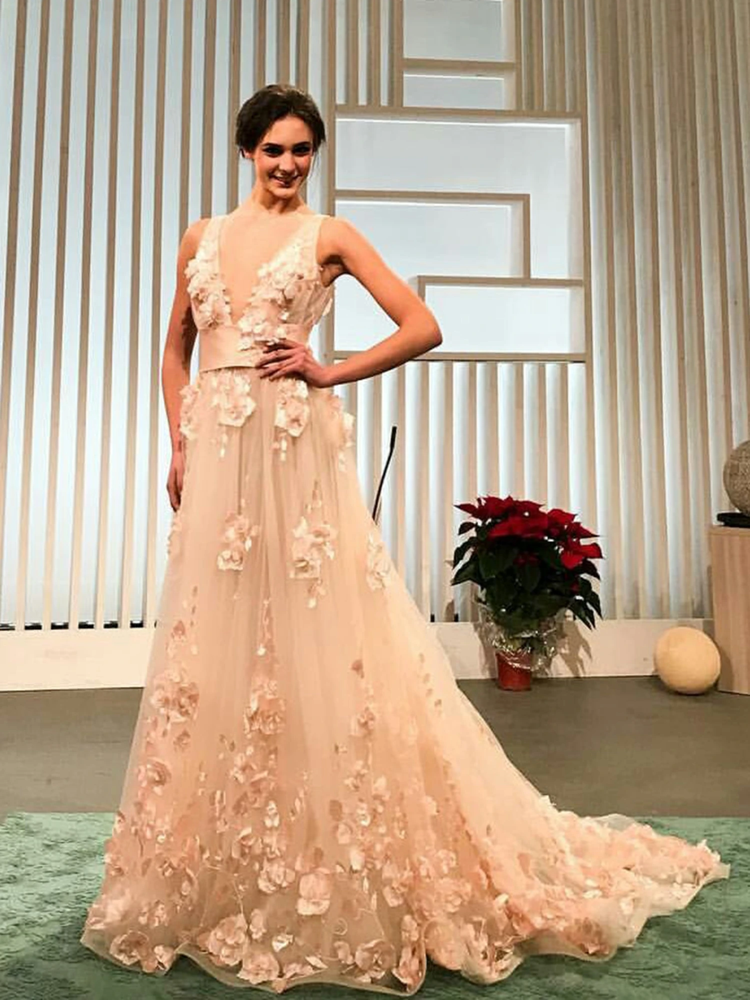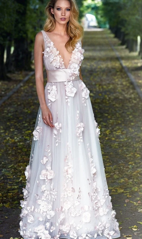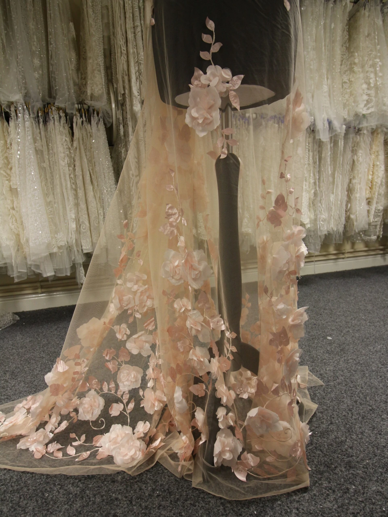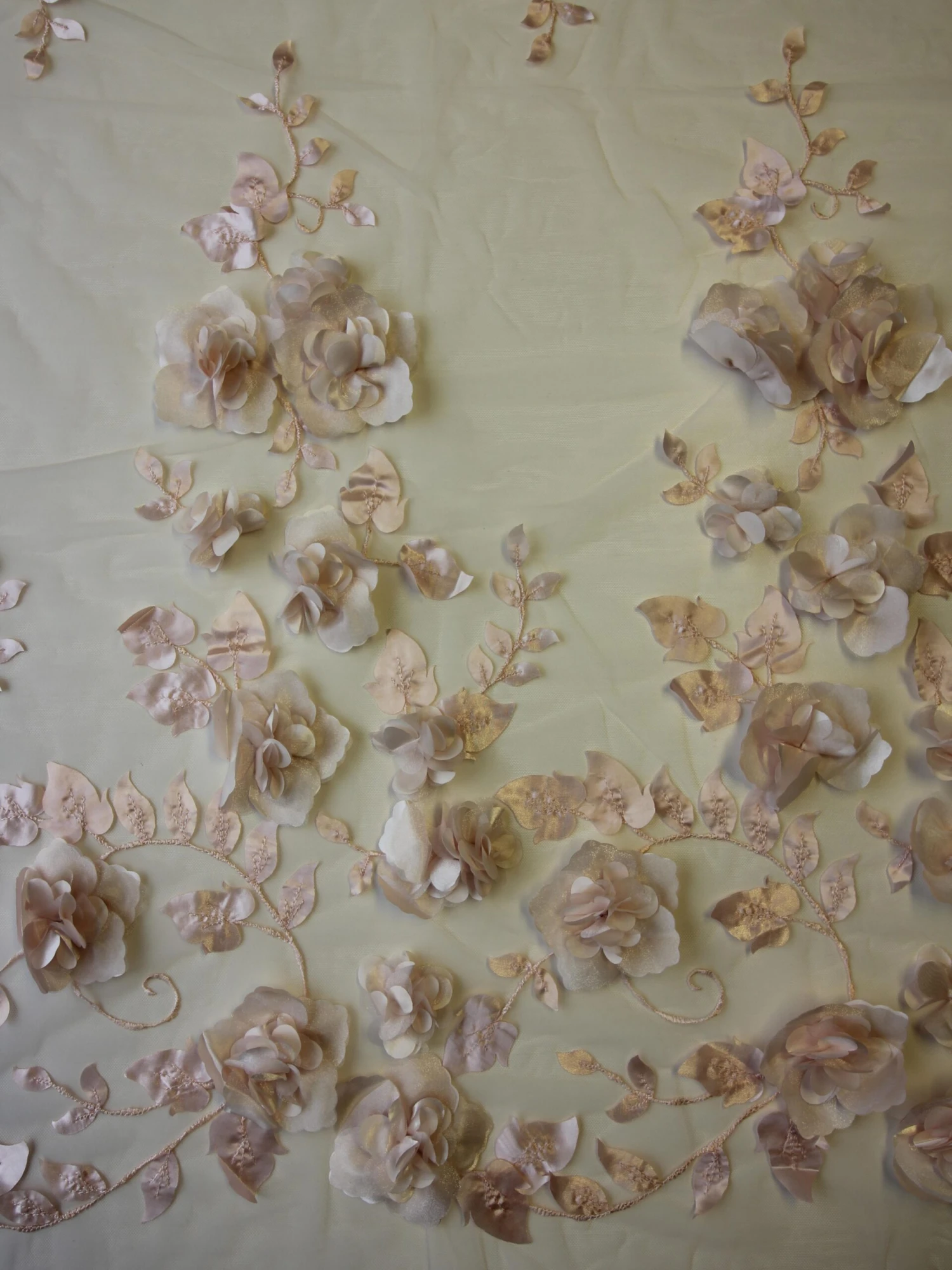 An eye catching and daring blush pink lace that measures 132 cm (52″) wide and features a variety of different sized 3D fabric flowers sitting proud of the blush tulle base over which a laser cut leaves are adorned. This is a beautiful lace and we recommend you order a sample to appreciate the soft pink colour and beautiful flowers for yourself – the first two samples are free. We also offer this in ivory