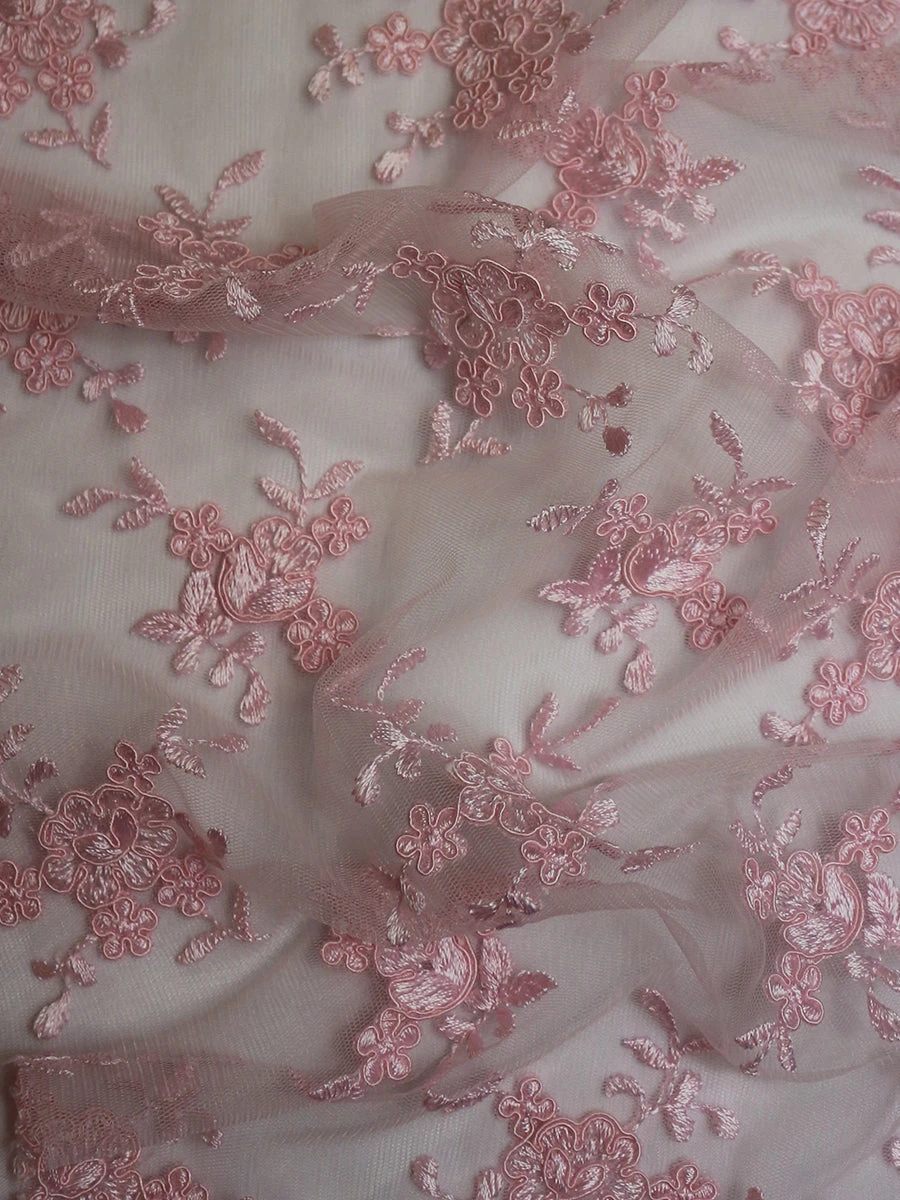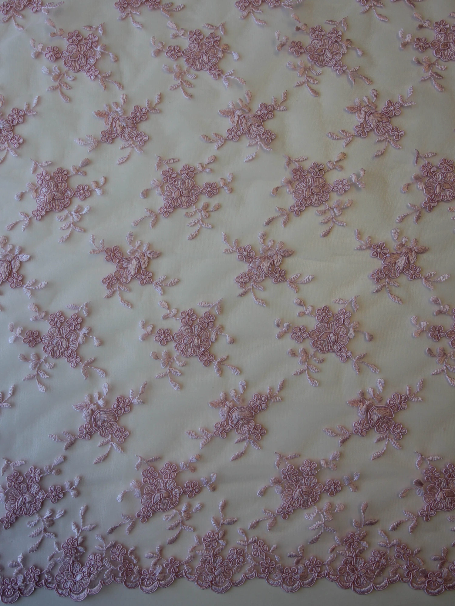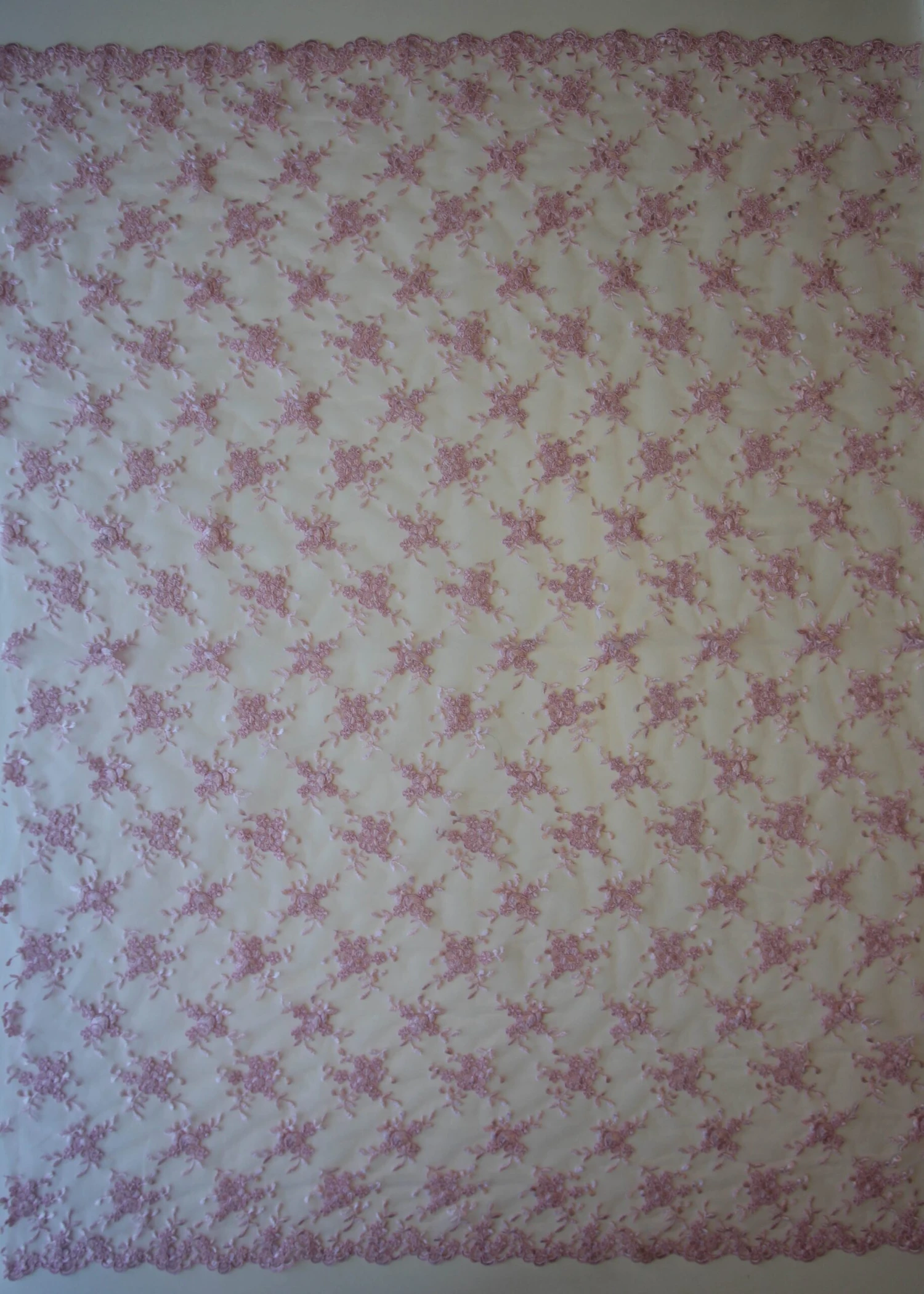 The floral motifs cover the tulle evenly from one delicate corded scalloped edge to the other. The edges of this lace are symmetrical and feature a corded scalloped edge and further delicate flowers. Geraldine measures 136 cm (53.5″) wide and is available in a range of colours.