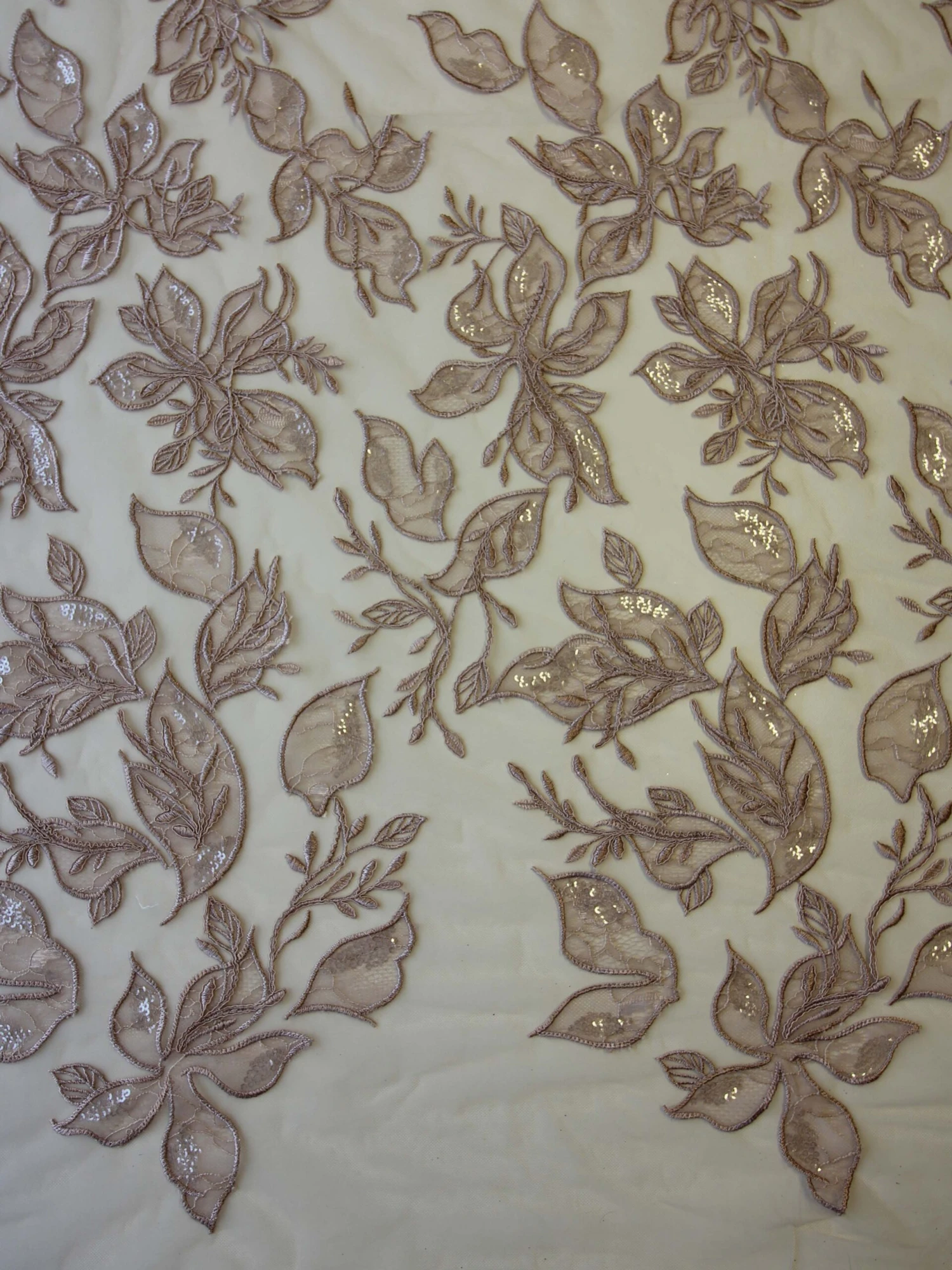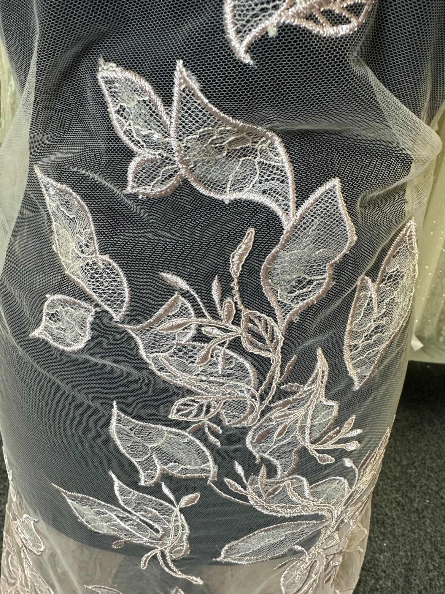 A dramatic lace with embroidered detail on an ivory tulle base, this measures 132 cm (52″) wide and features a leafy display.