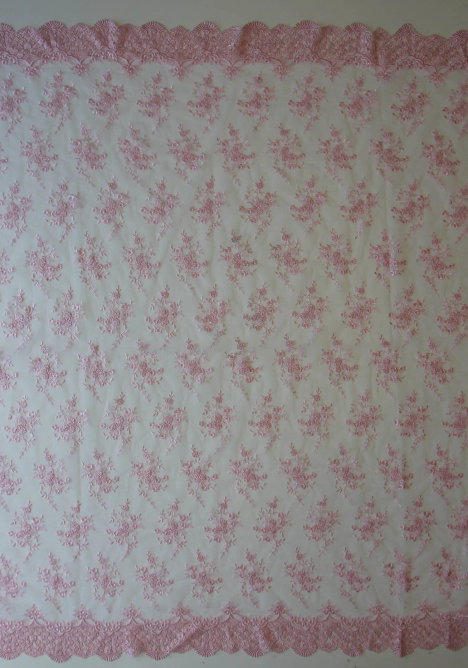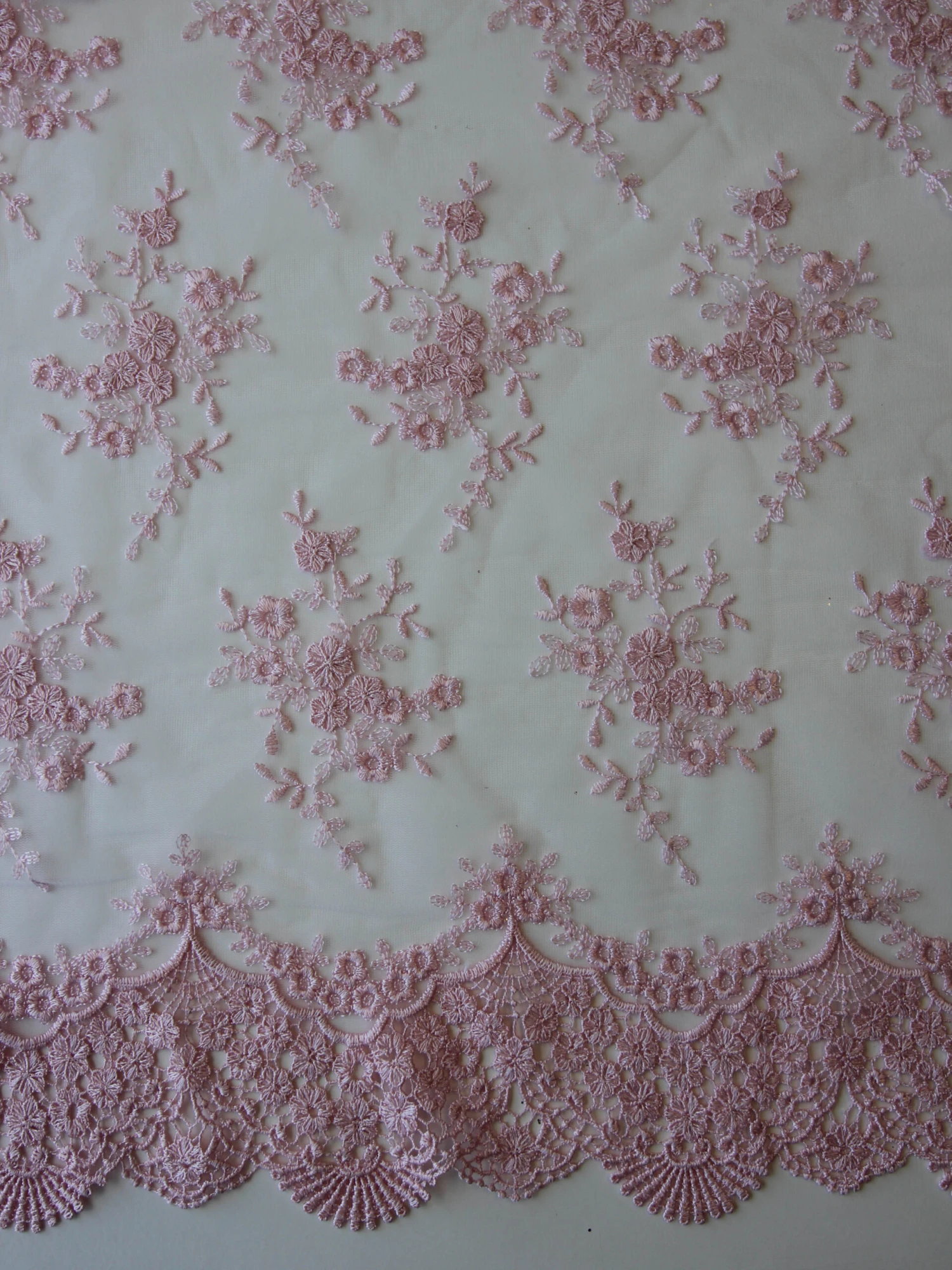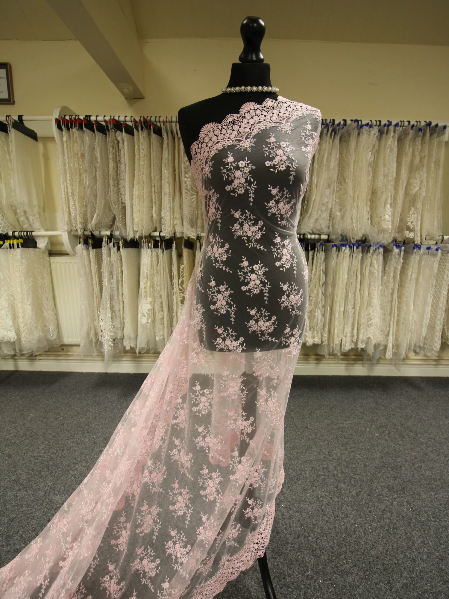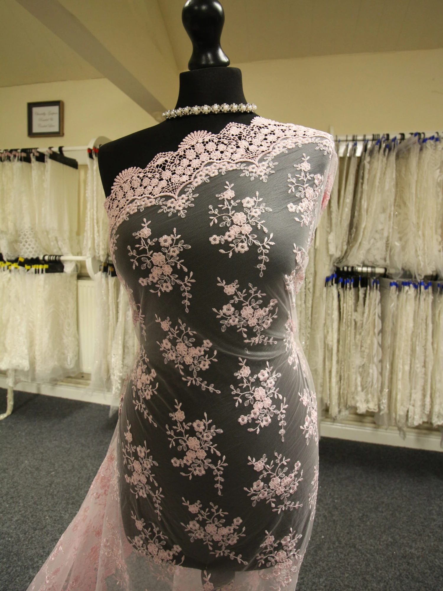 A pale pink lace, which has a lovely delicate embroidered pattern, featuring small floral motifs framed by leaves across the tulle base.