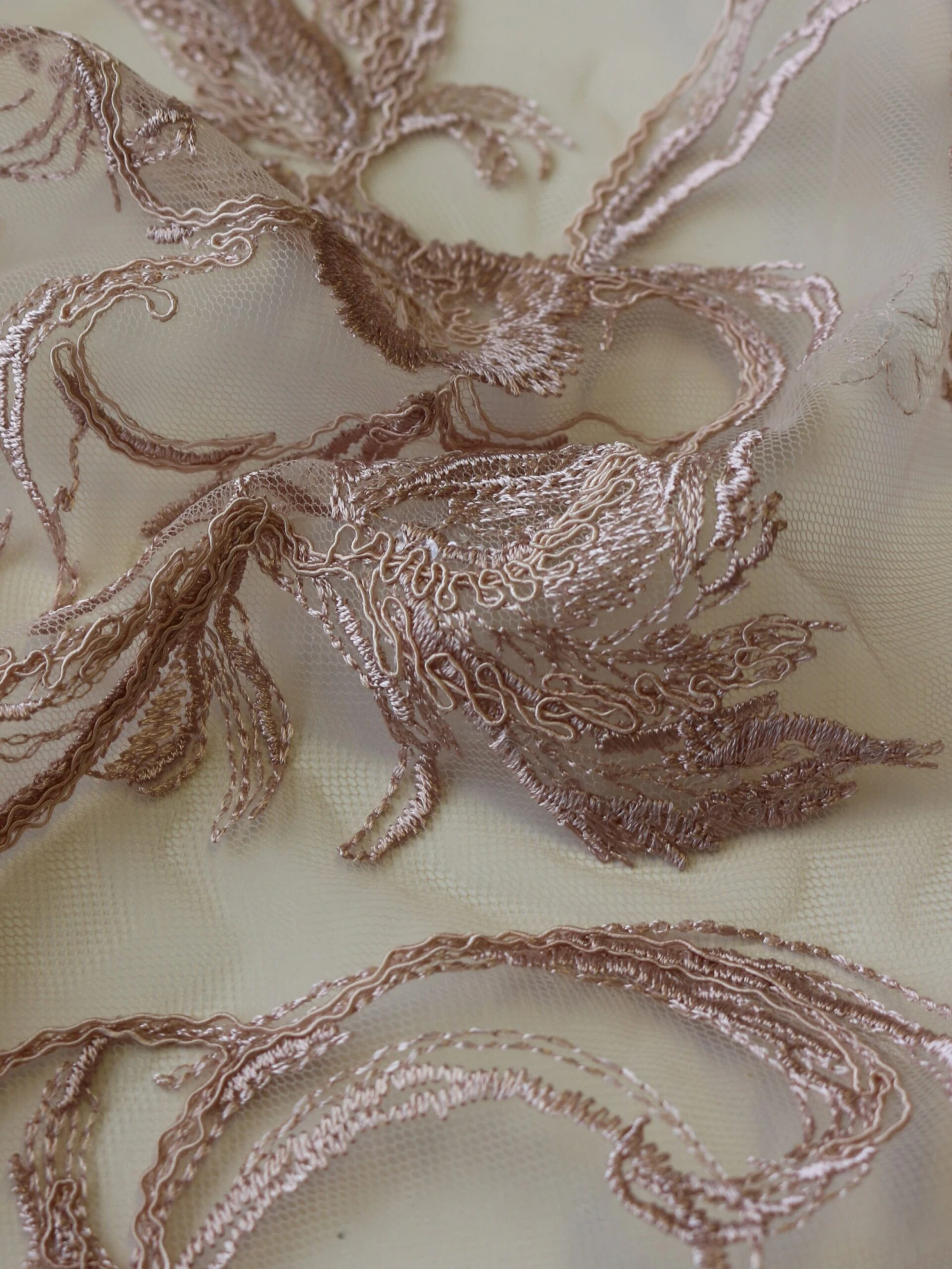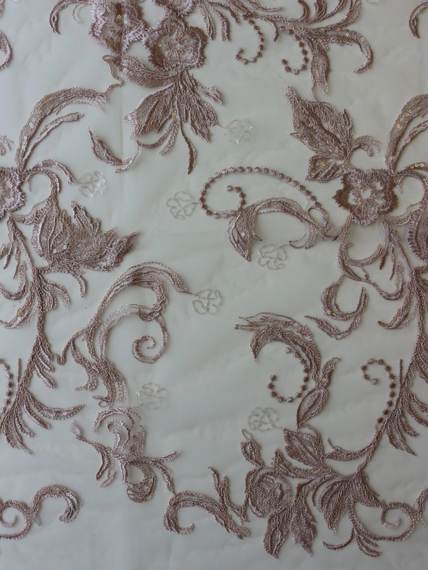 A contemporary embroidered lace that features a tulle base and delicate, subtle embellishment with clear colourless sequins.