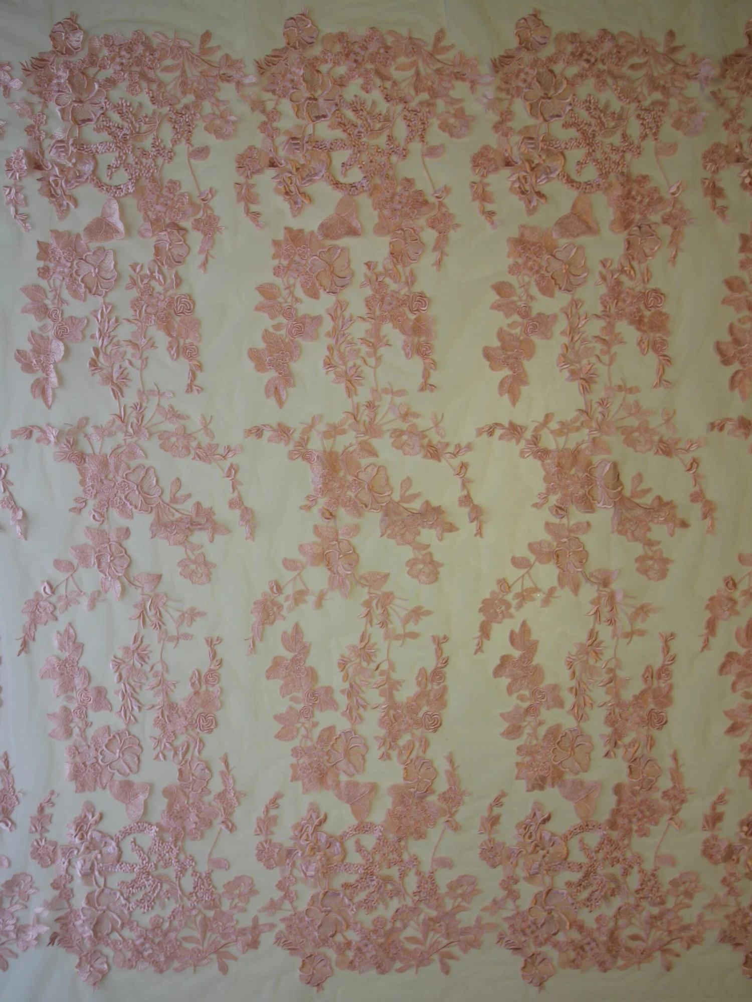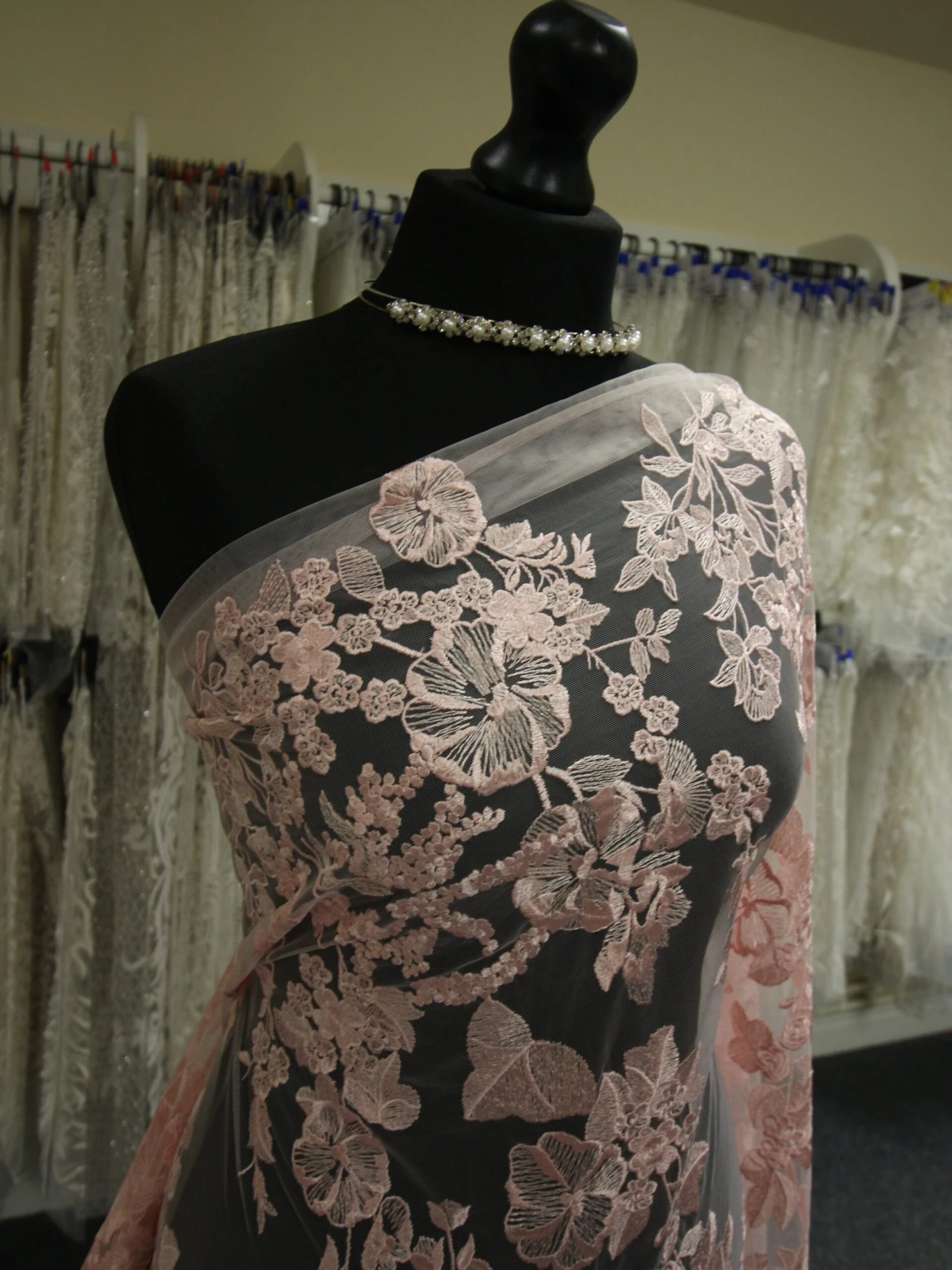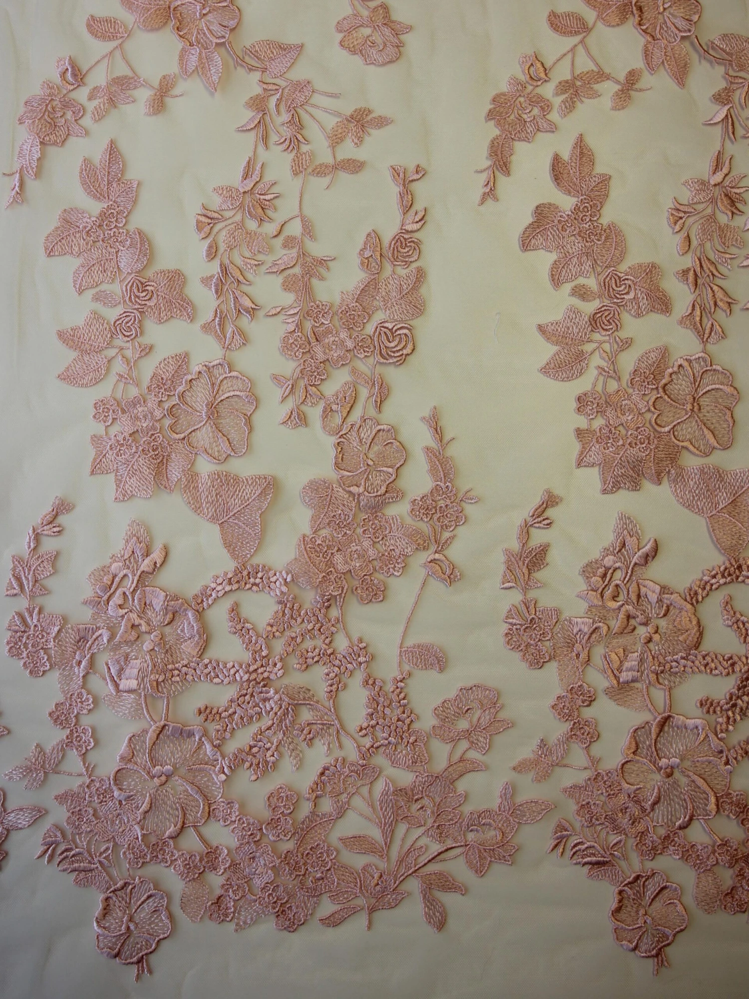 A feminine pink embroidery lace that has a regal floral theme running through its pattern. This design is also available in a range of other shades. Both sides of the pattern match one another. This measures 132 cm (52″) wide.