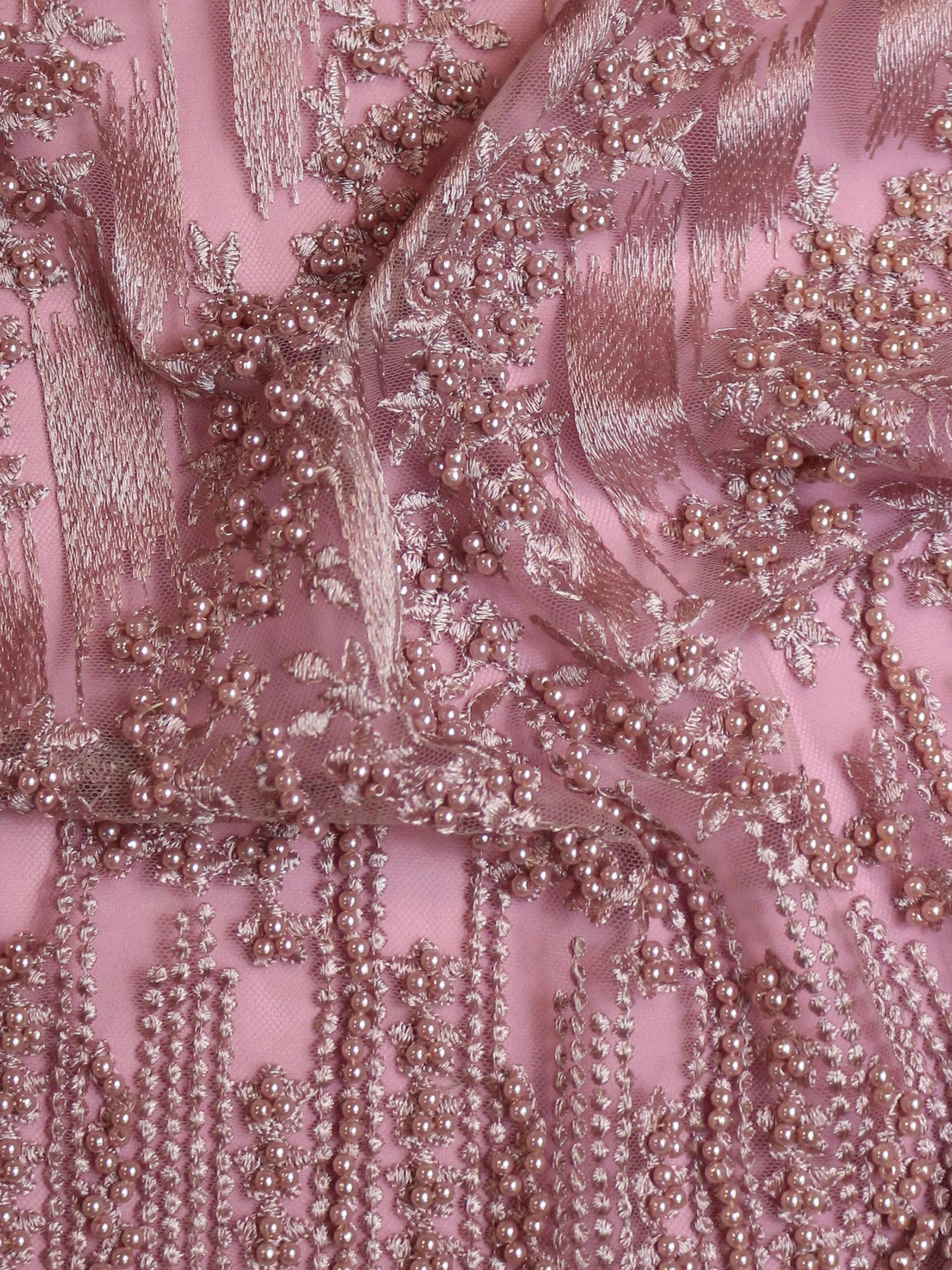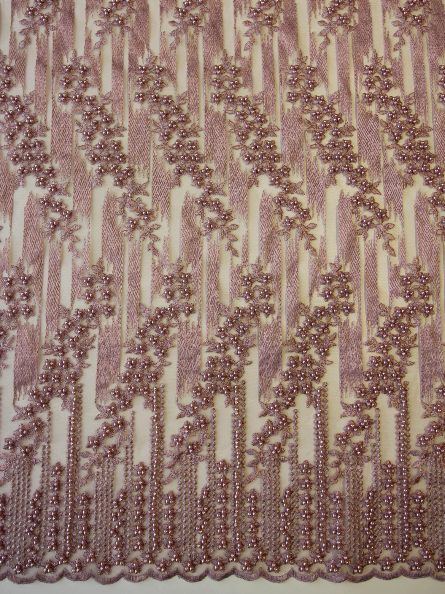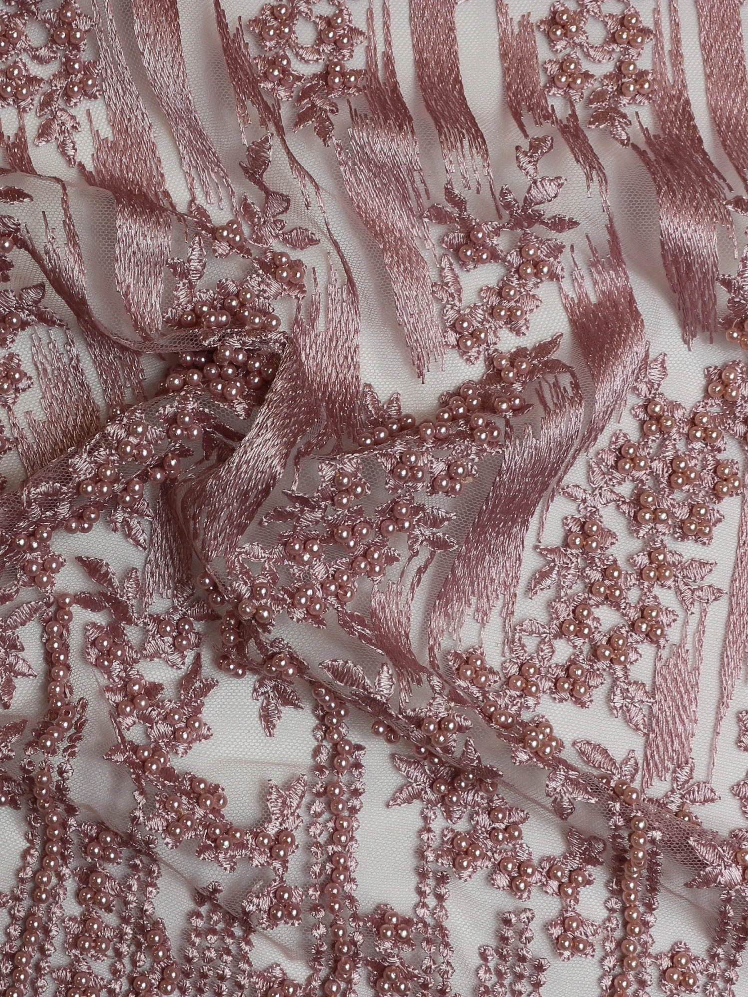 A gorgeous dusky pink lace, that features stunning embroidery and pearl embellishment to a very modern non floral design on a tulle base. This lace measures 135 cm (53″) wide and has matching edges.