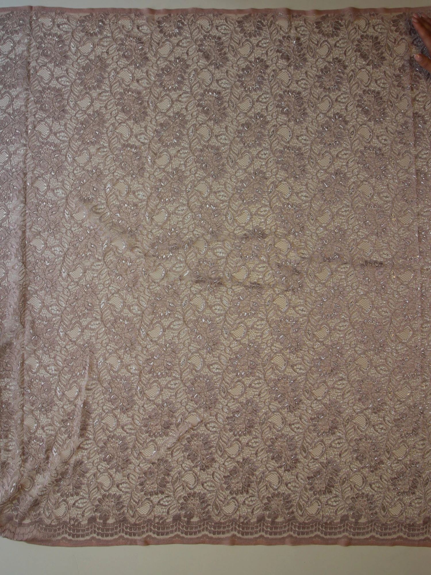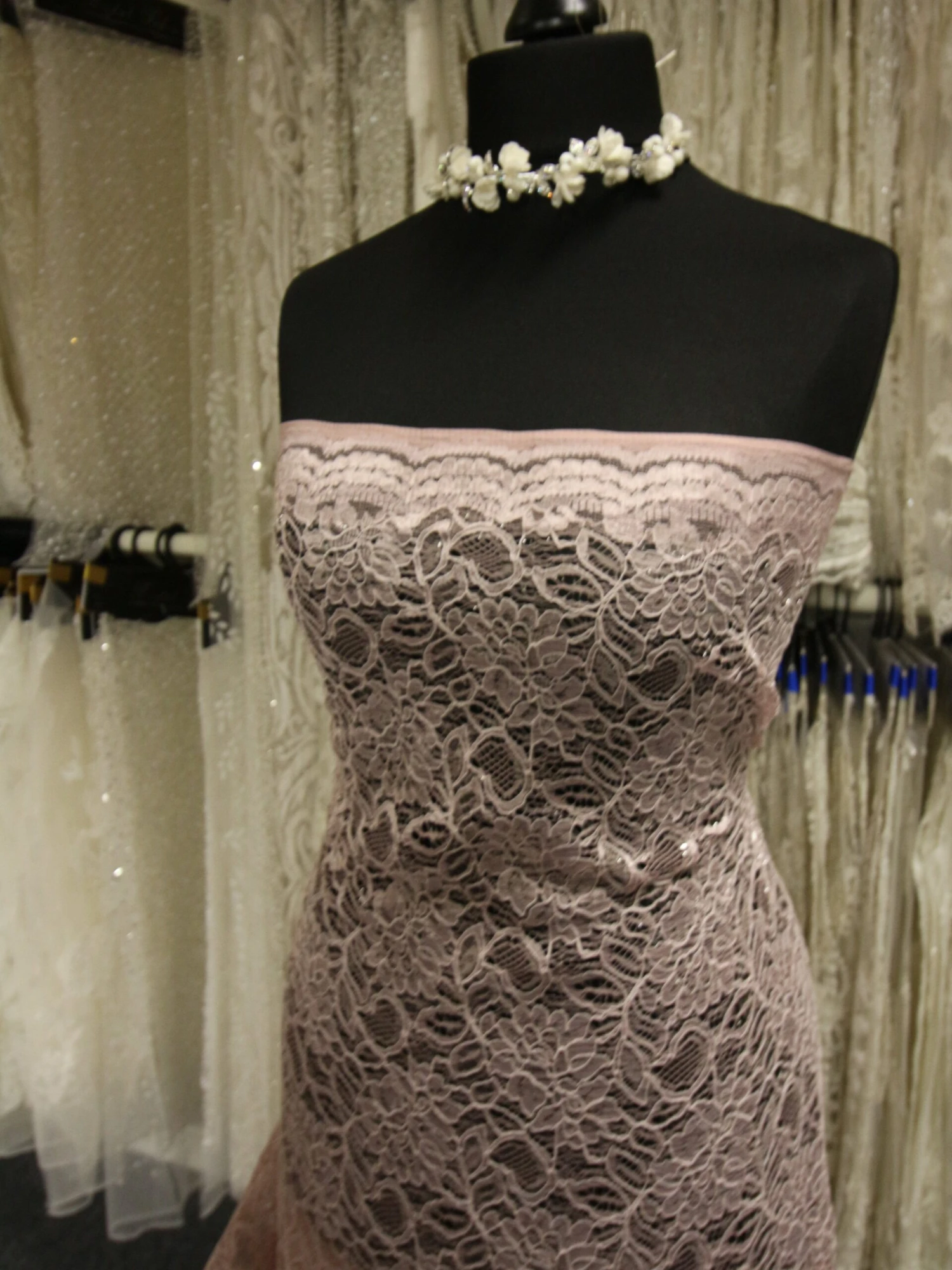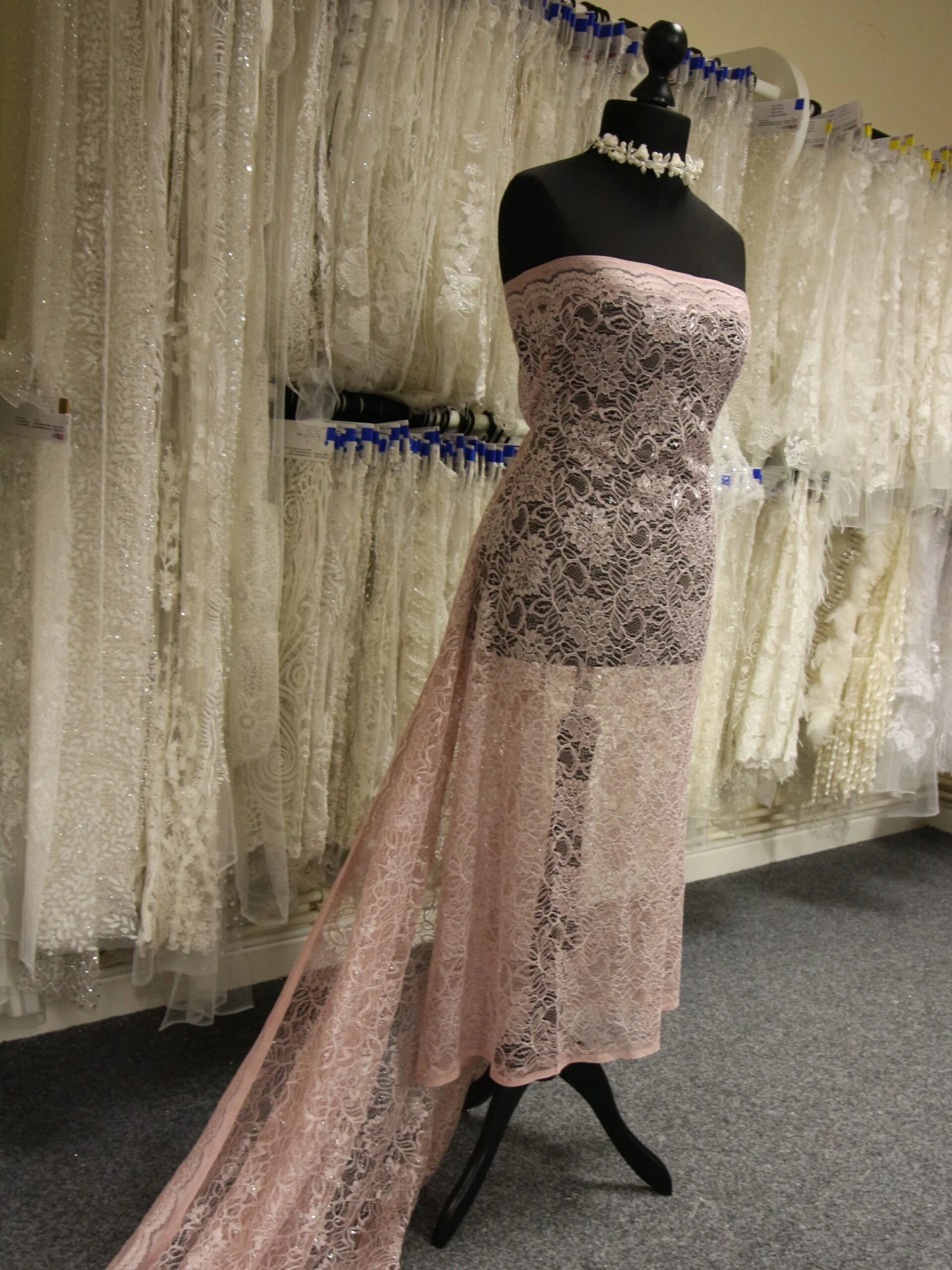 Offered in a great range of colors, Ezra is a superb pale pink lace for mother of the bride, occasion wear and evening wear. The base Raschel weave is diverse with closely woven and open woven sections creating the wonderful floral design that is the base of this lace. The flowers and swirls are further highlighted by delicate cording.