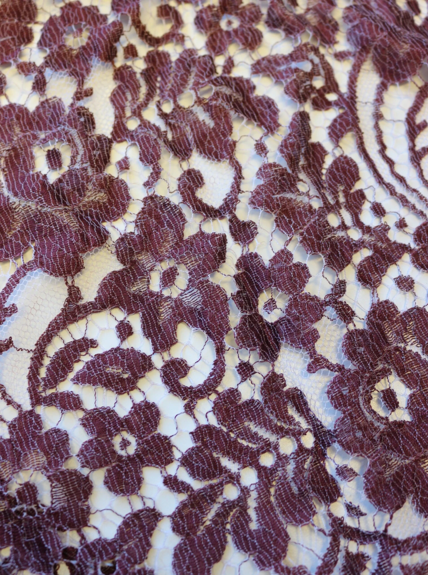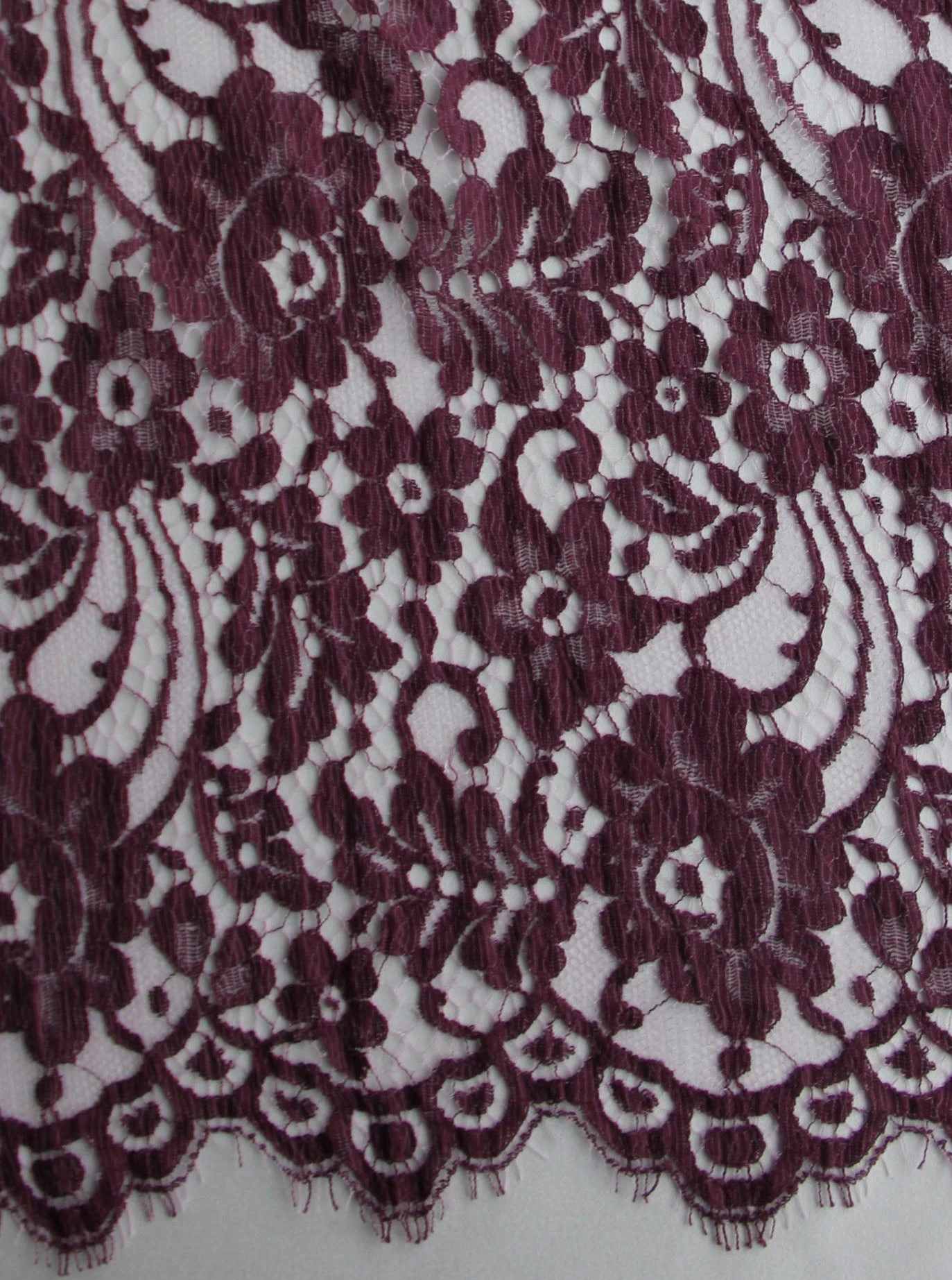 This beautiful plum bridal lace originating from the Chantilly area in Northern France and measuring 90 cm (35″) wide. Both borders are scalloped and fringed.