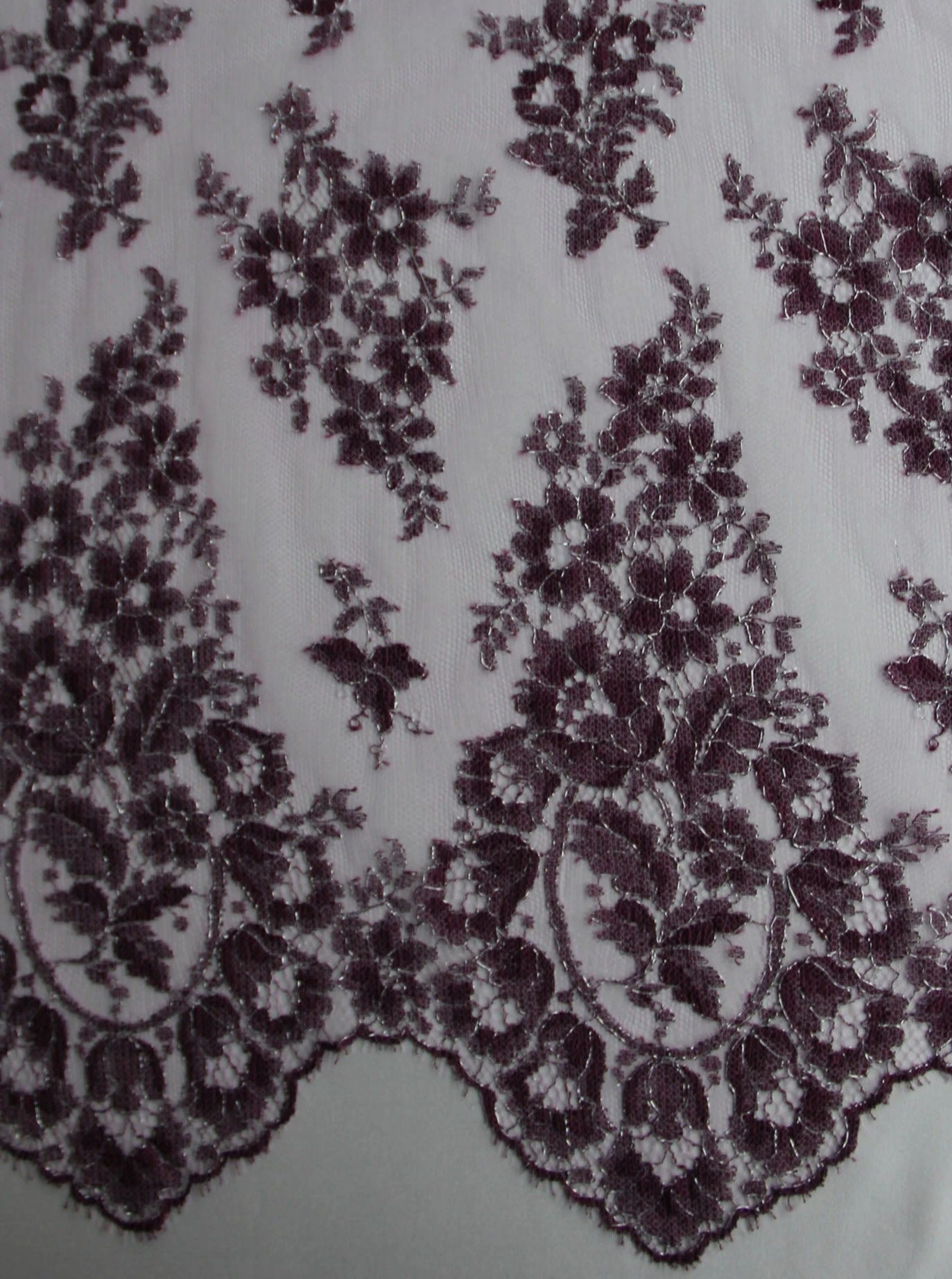 Wendy in plum is a delicate lace that was measures 109 cm (43″) wide and features delicate shading throughout to form a very feminine floral effect. There is a soft subtle silver thread that runs through the motifs in the lace.