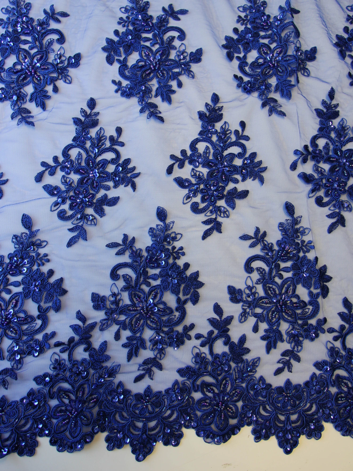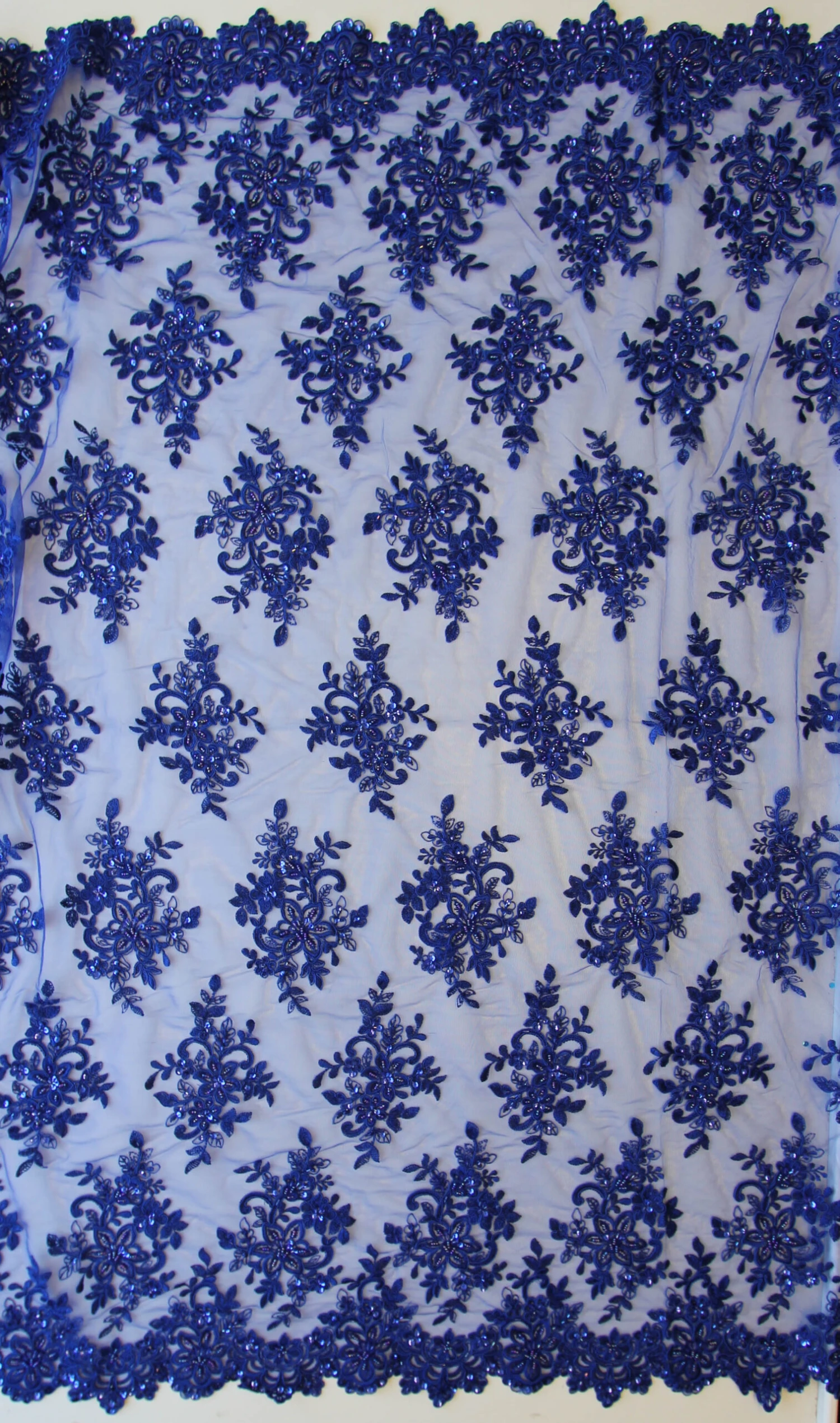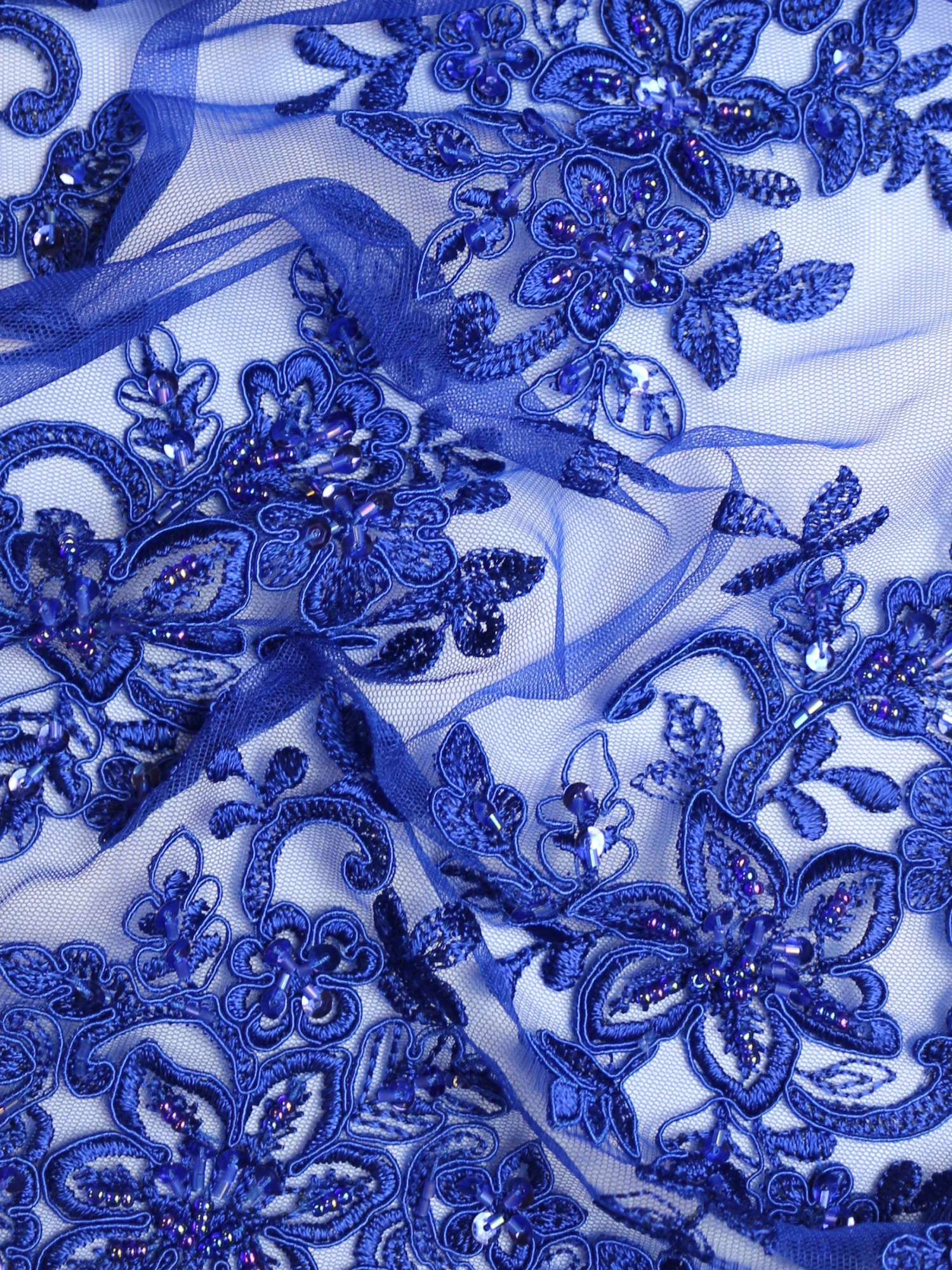 A magnificent beaded and sequined royal blue lace that measures 132 cm (52″) across the width.
