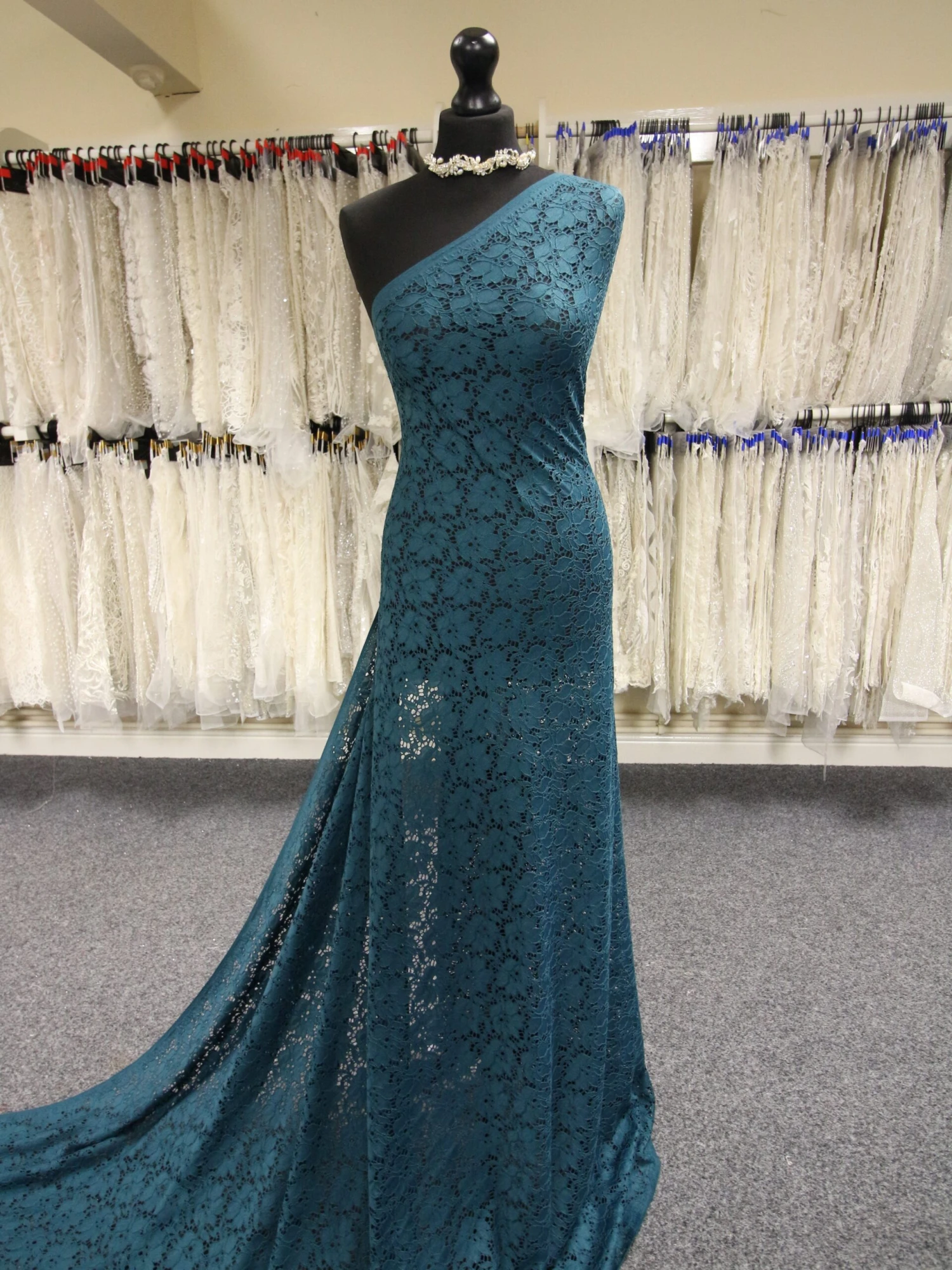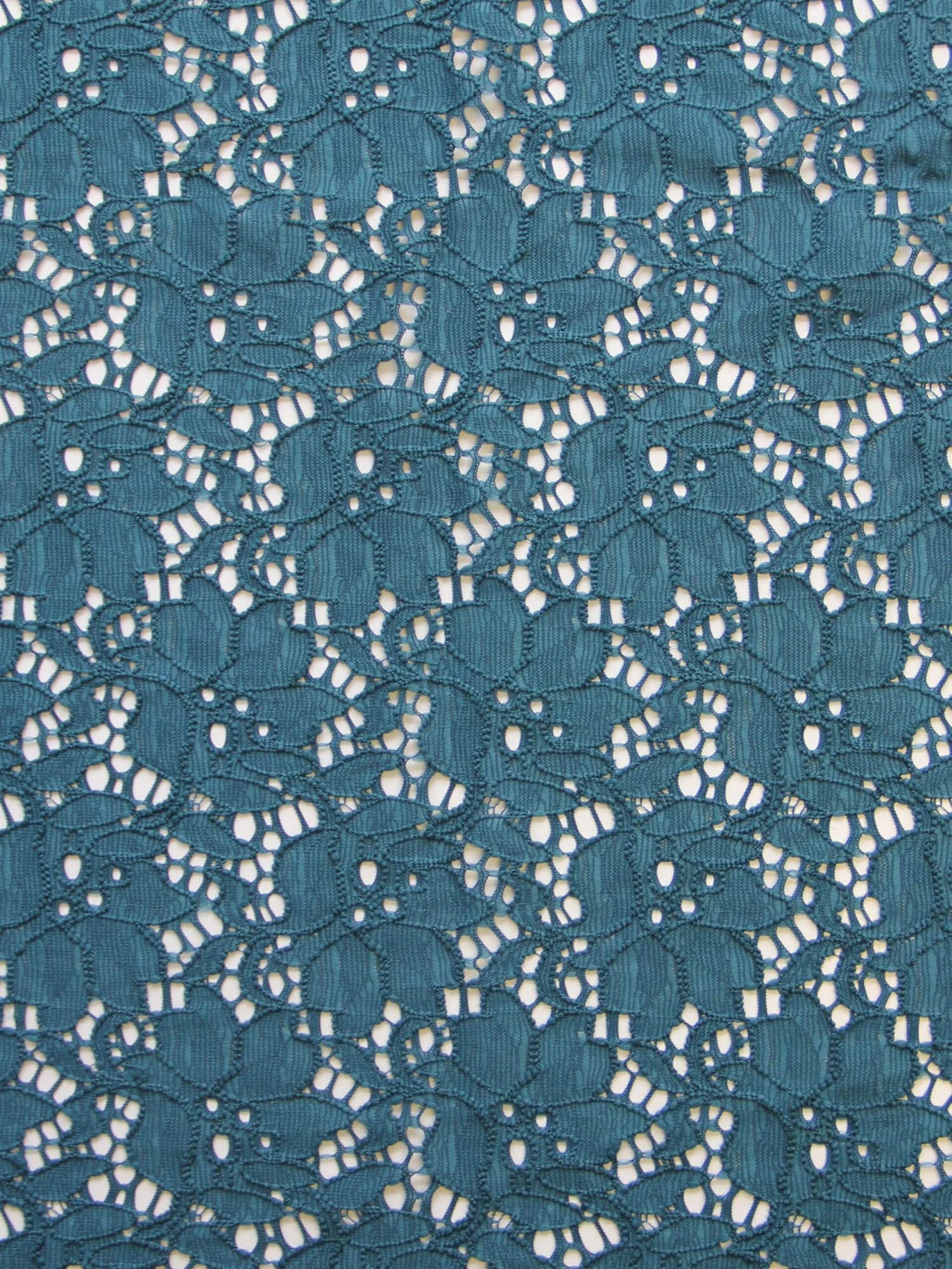 A rich teal (green/blue) coloured lace measuring 150cms wide with a floral pattern running throughout.