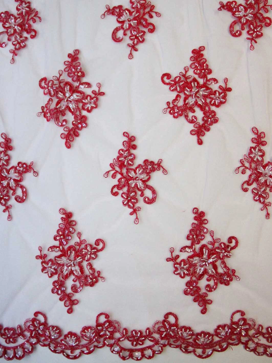 We offer our most popular beaded design – Alexandra, in a range of colours as well as the traditional bridal shades. Here you can see it in red. It is a heavily beaded and corded Border Lace on a fine tulle ground. The floral motifs are finely corded with sequins, beads and diamantes.