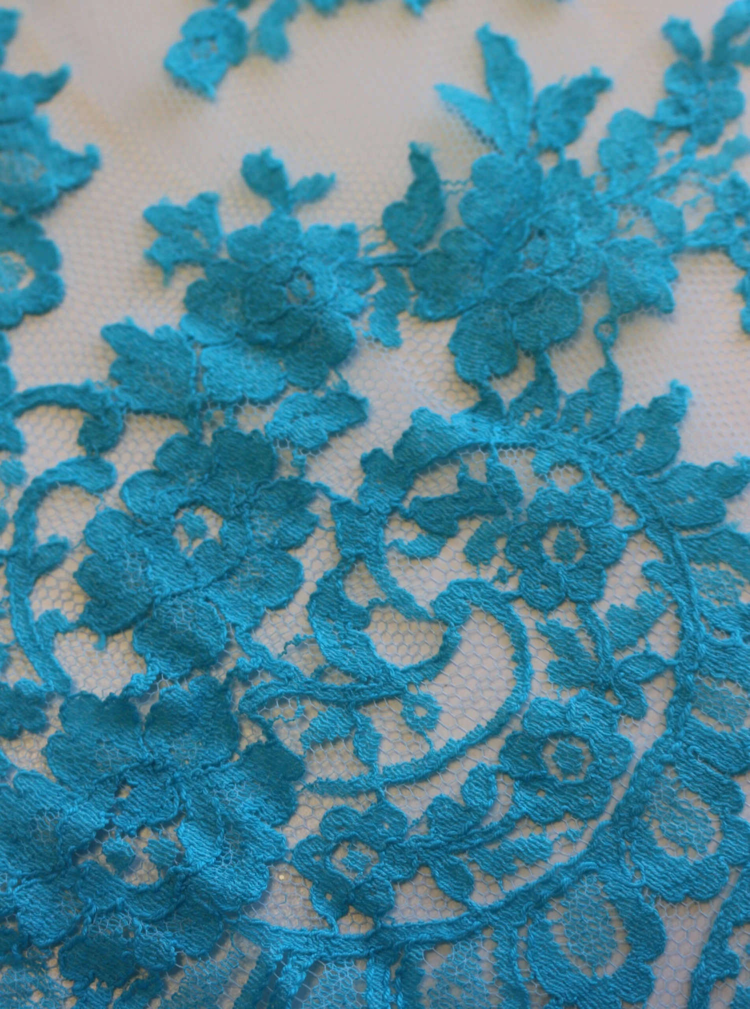 A vibrant turquoise Chantilly Lace measuring 96 cm (38″) wide that has a delicate looking pattern with a border made up of flowers and an almost paisley shaped tear drop. Throughout the body of the lace are identical 1 flower floral motifs.