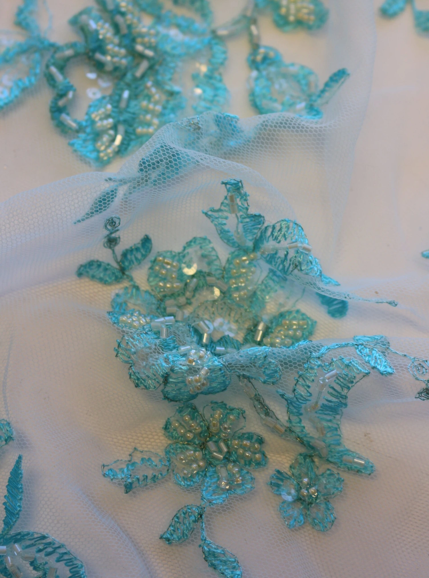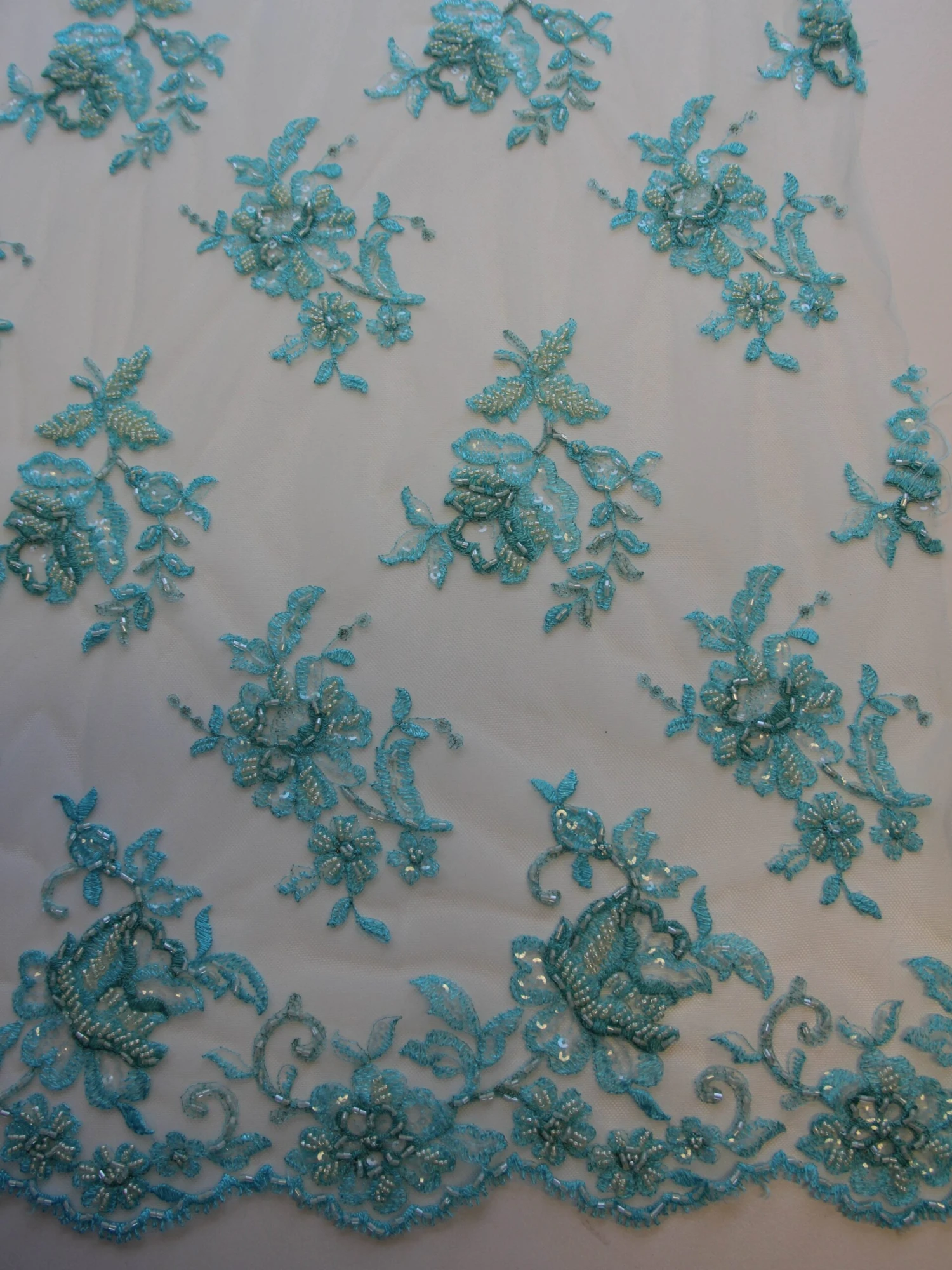 Chloe a youthful and vibrant lace with lovely beaded detail on a embroidered tulle base. We offer it in a range of colors and here you can see it in a bright and eye catching turquoise blue. This design has matching borders and incorporates 2 single flower motifs which are quite distinct. Both motifs are overlaid with sequins and beads and are outlined with a fine filigree metal thread, making a stunning combination.