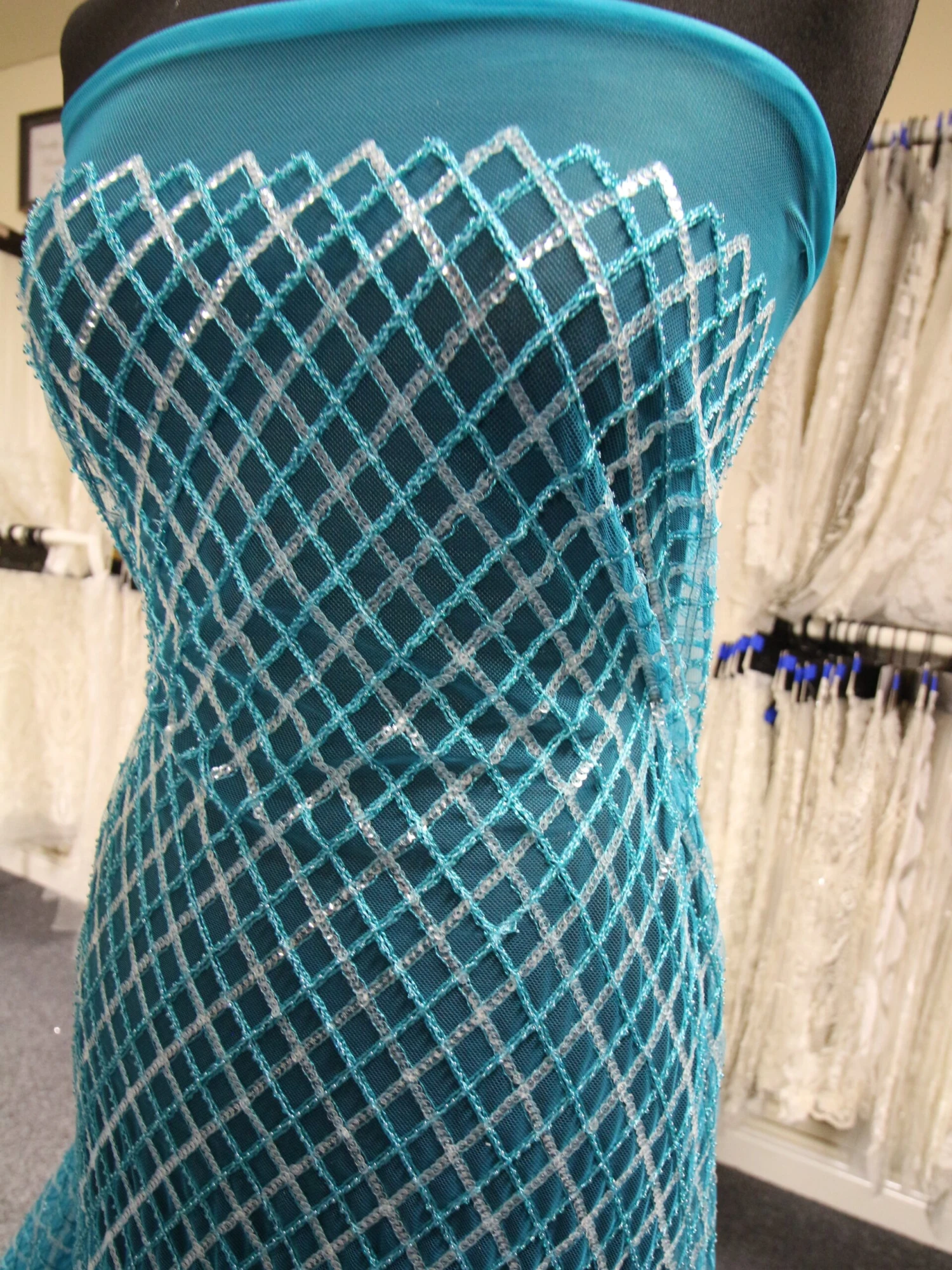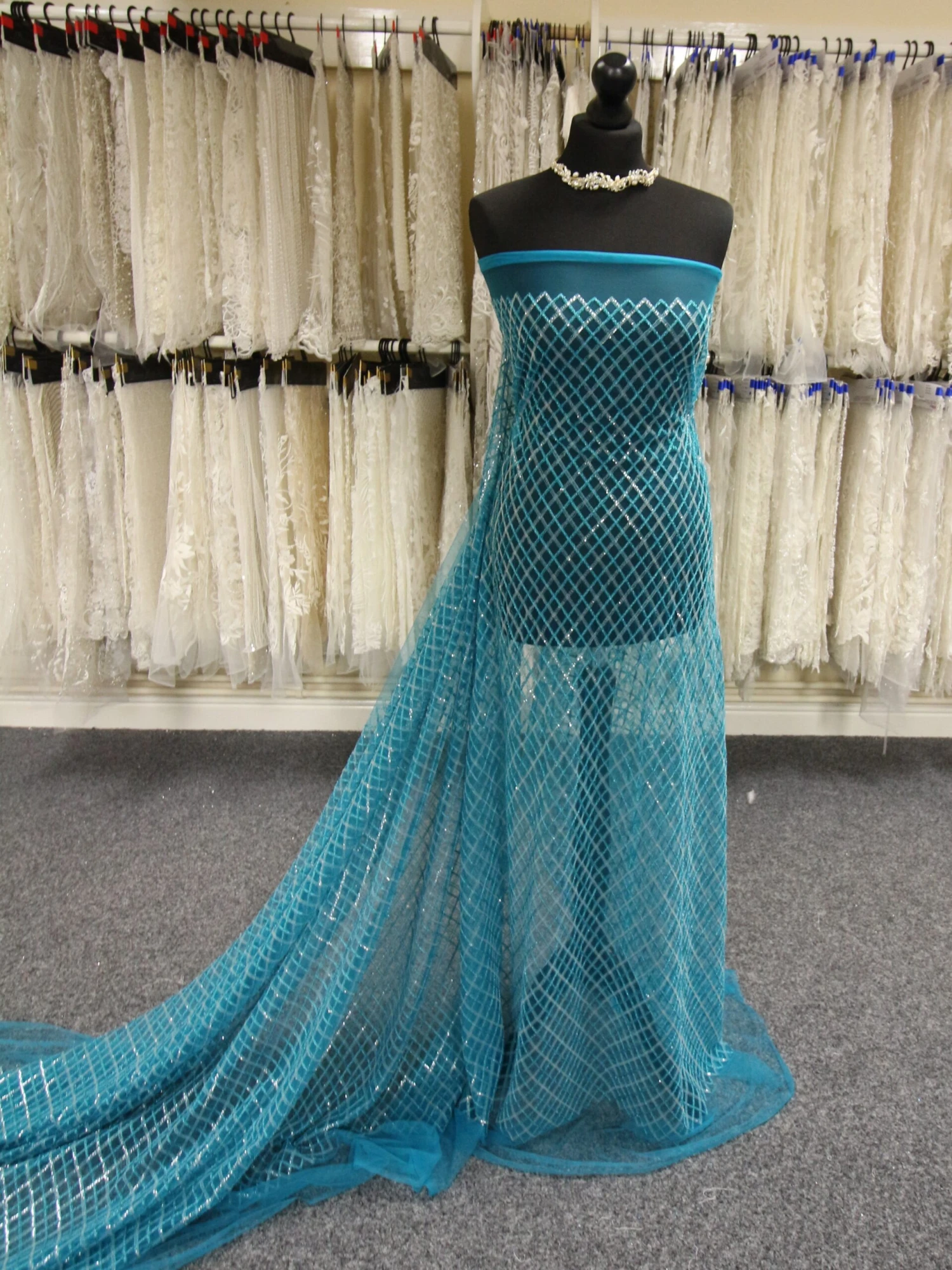 A sexy and glamorous turquoise diamond shaped lattice work, that features a heavy use of sequins and beads, this measures 132 cm (52″) wide. A sophisticated product for elegant evening wear.
