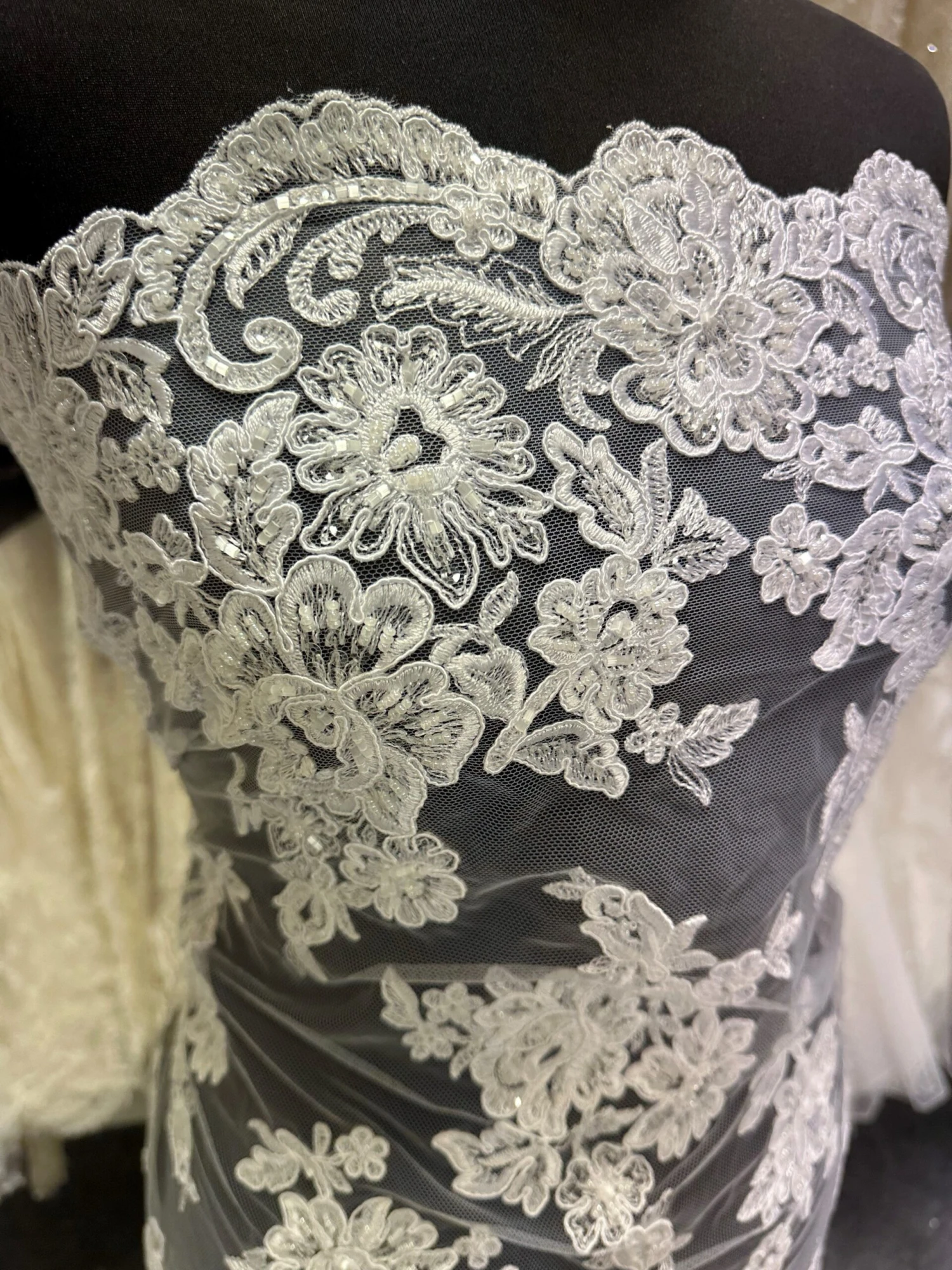 A very extravagant glitzy Hollywood style design, Victoria Lace is also available in Ivory or in our range of coloured laces.