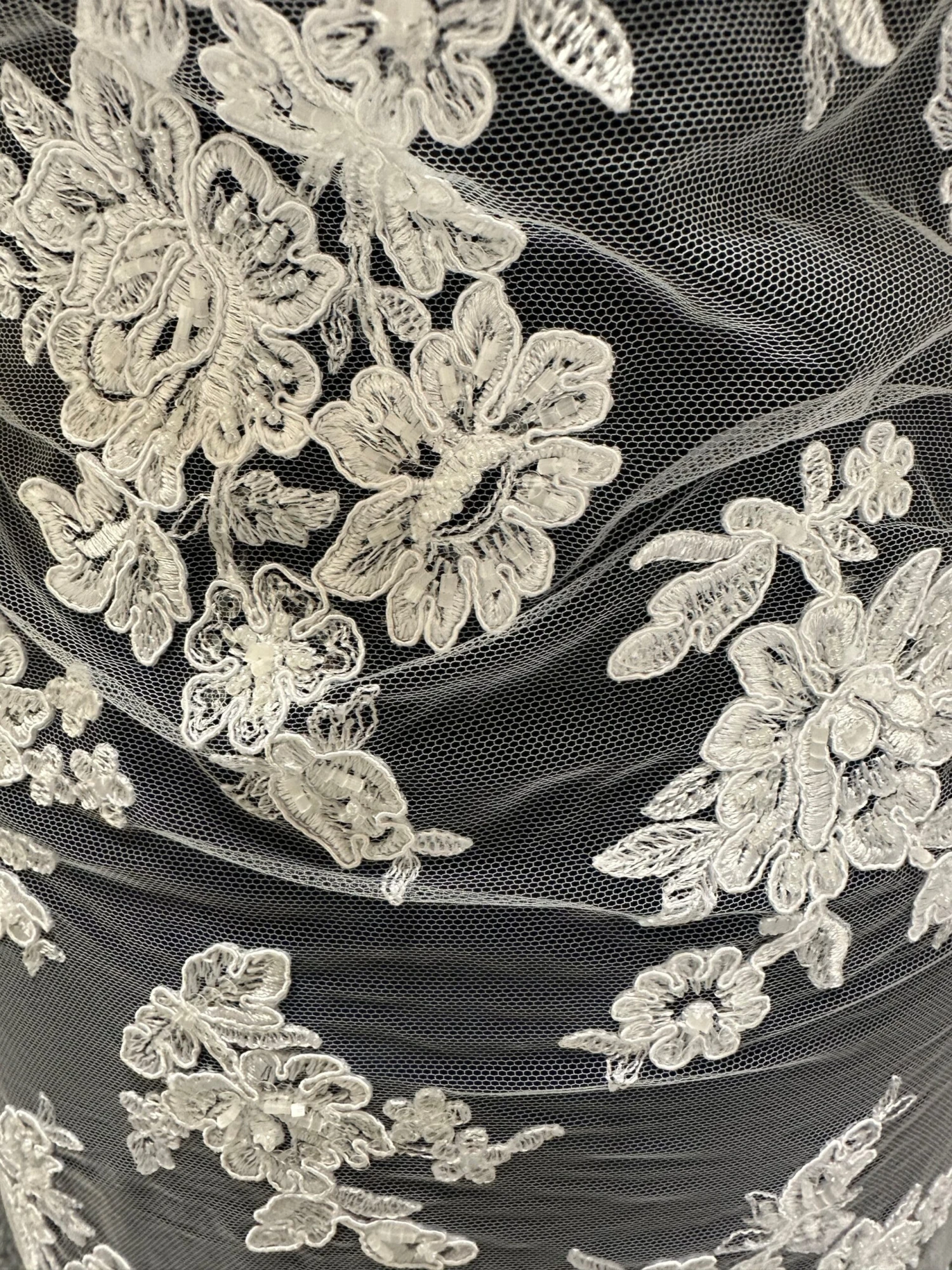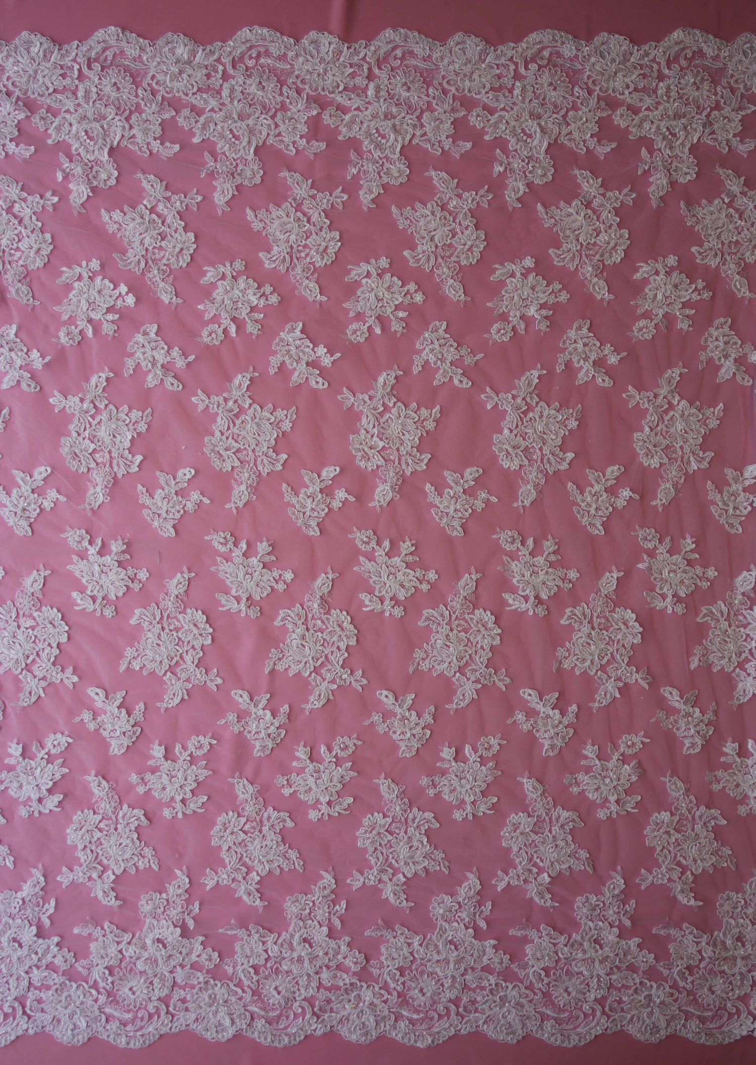 The identical borders are 25 cm (10″) in depth and are scallop edged. The width of the lace is 132 cm (52″).