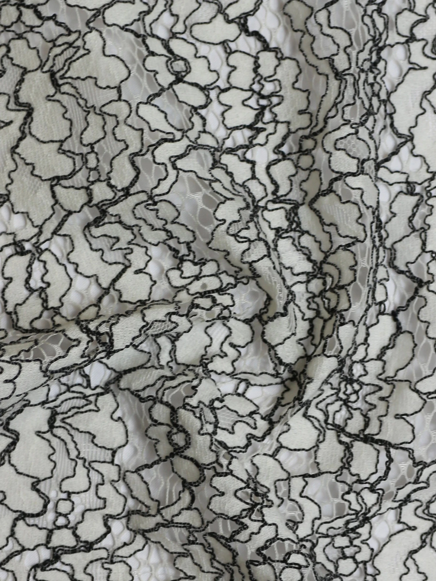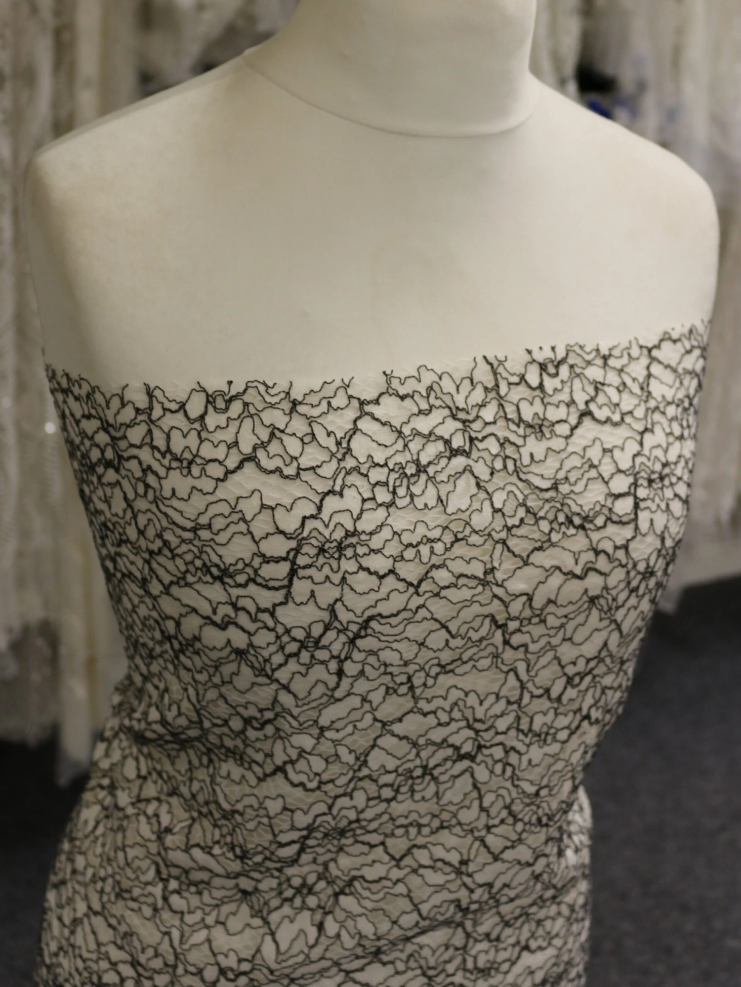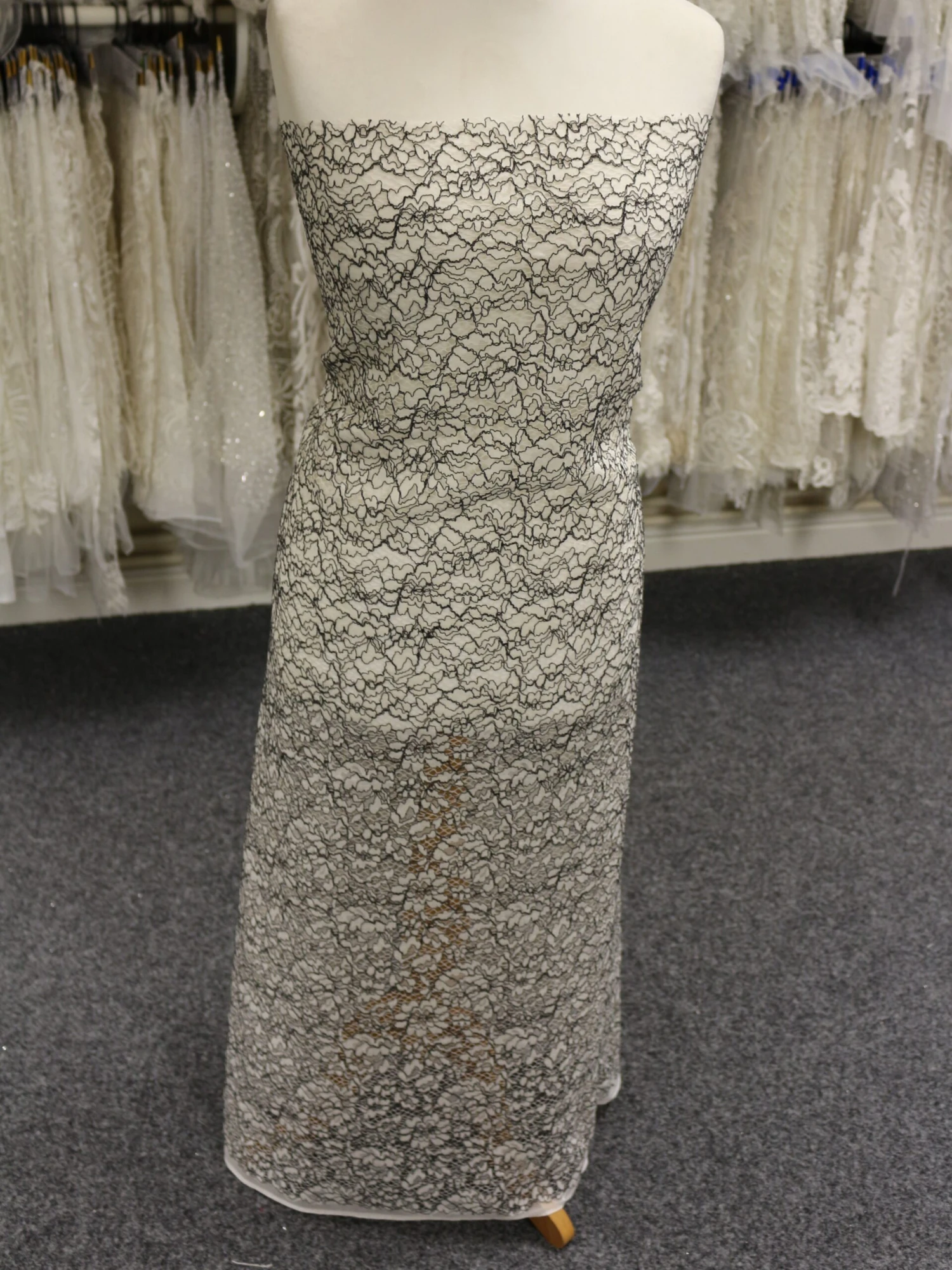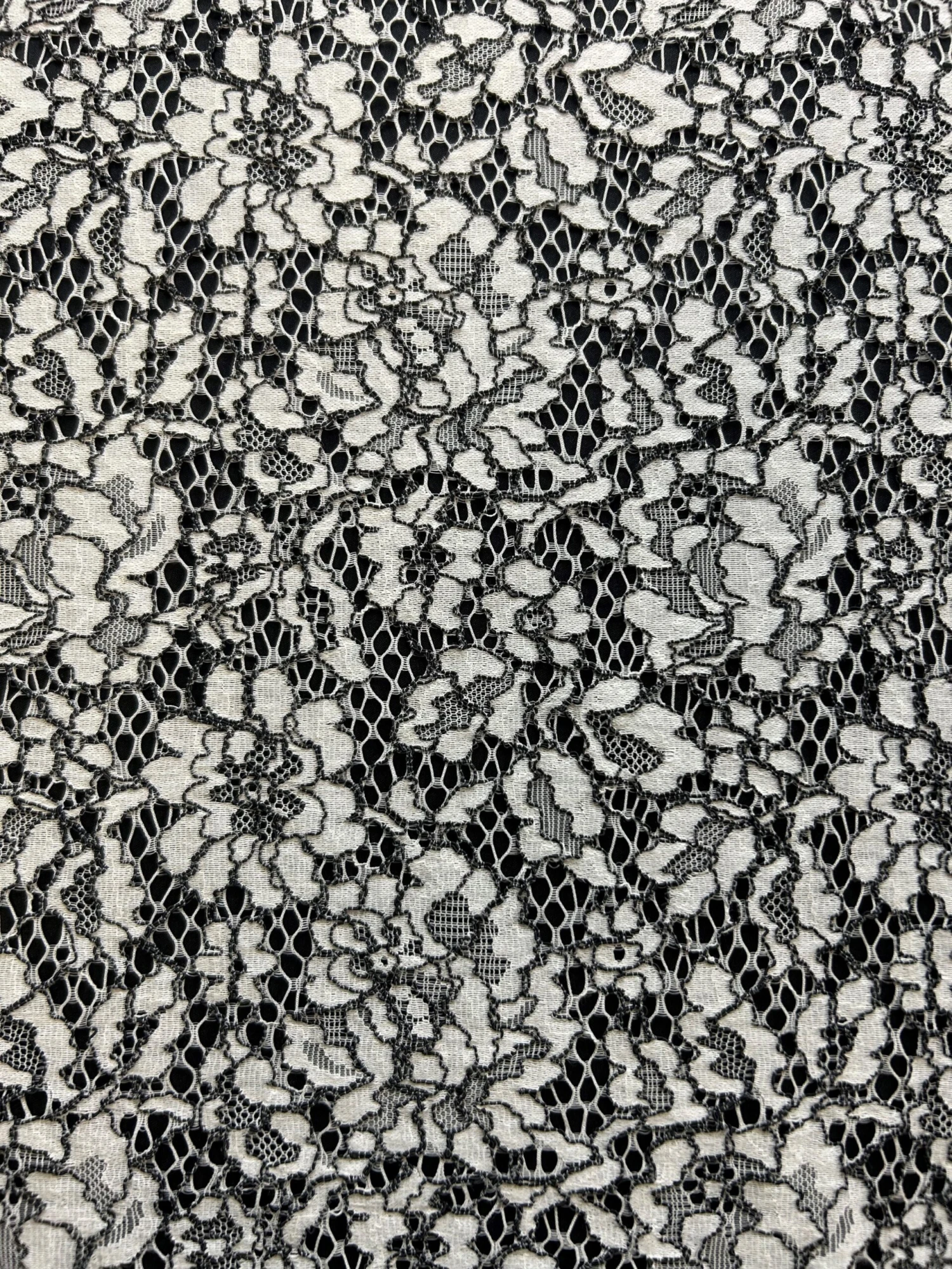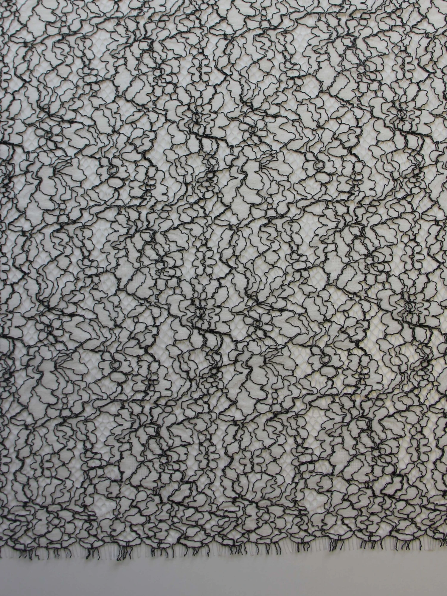 A very fashionable lace fabric in a yellow embroidered ground with black corded detail. This is supplied in panels that measure 1.6 metres (1.75 yards) The width is 148 cm (58″)