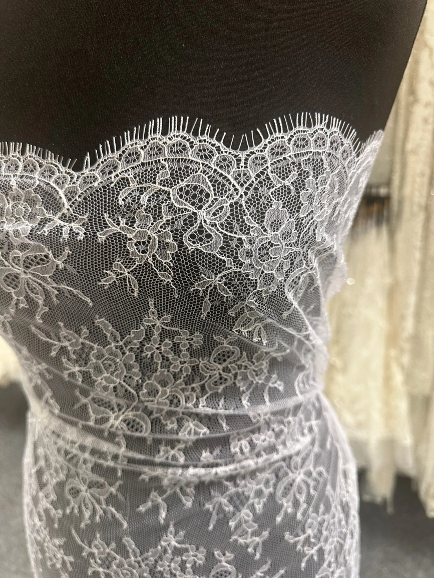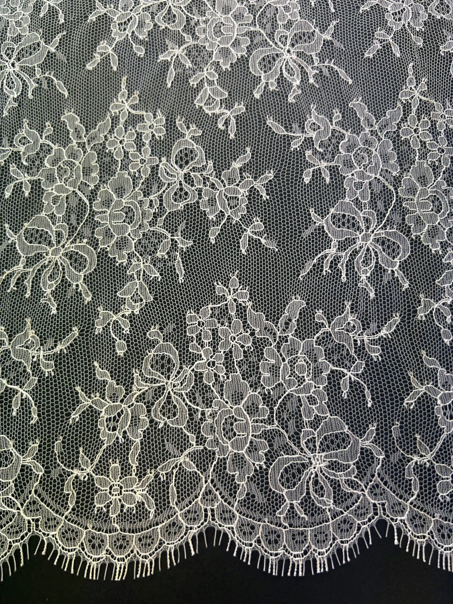 Francesca is a very delicate Chantilly lace with scalloped edges on both sides.