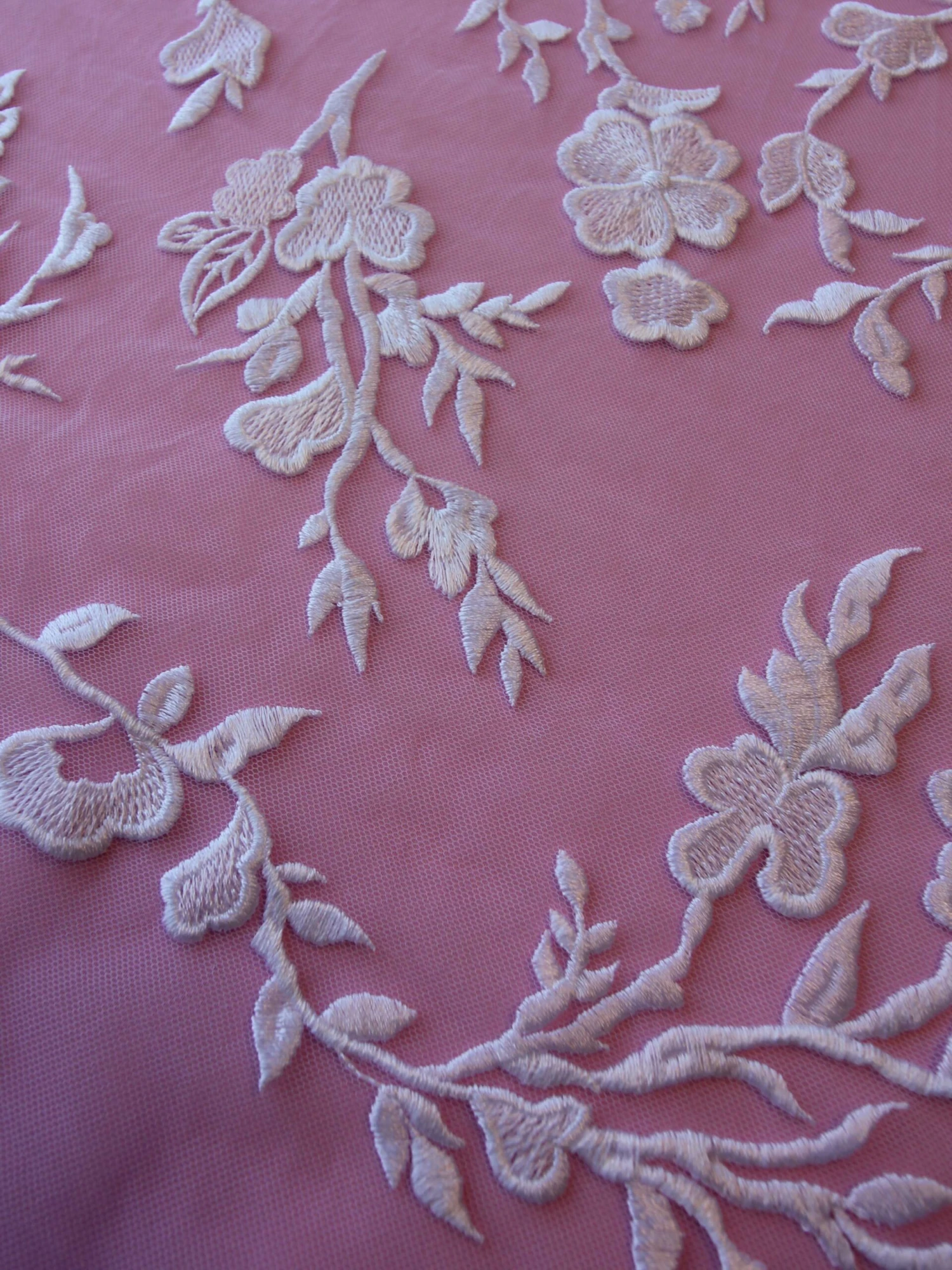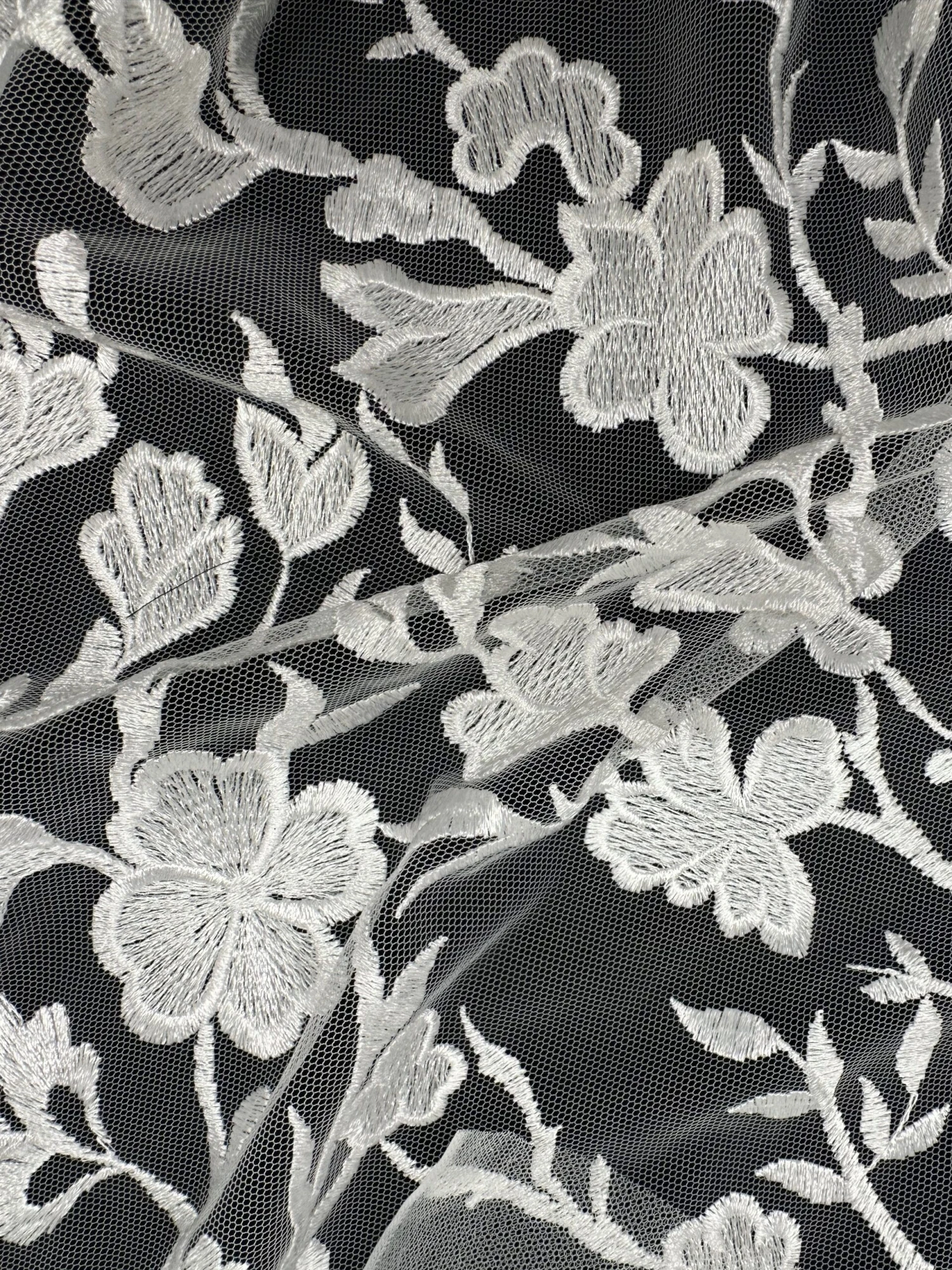 An attractively white embroidered bridal lace that features an attractive floral pattern that is different on one edge to the other.Â