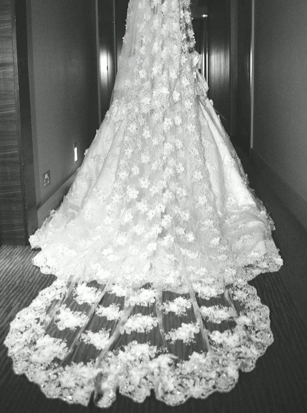 The identical borders are 20 cm (8″) in depth scalloped with a short fringe. The main feature of the borders are two raised flowers, made from fabric and lace, completed with a diamante at the centre of the flower. Smaller flowers are embroidered, overlaid with beads and finished with a silver filigree cord edging. There are around 36 motifs in each metre, which could be cut individually to embellish a gown.