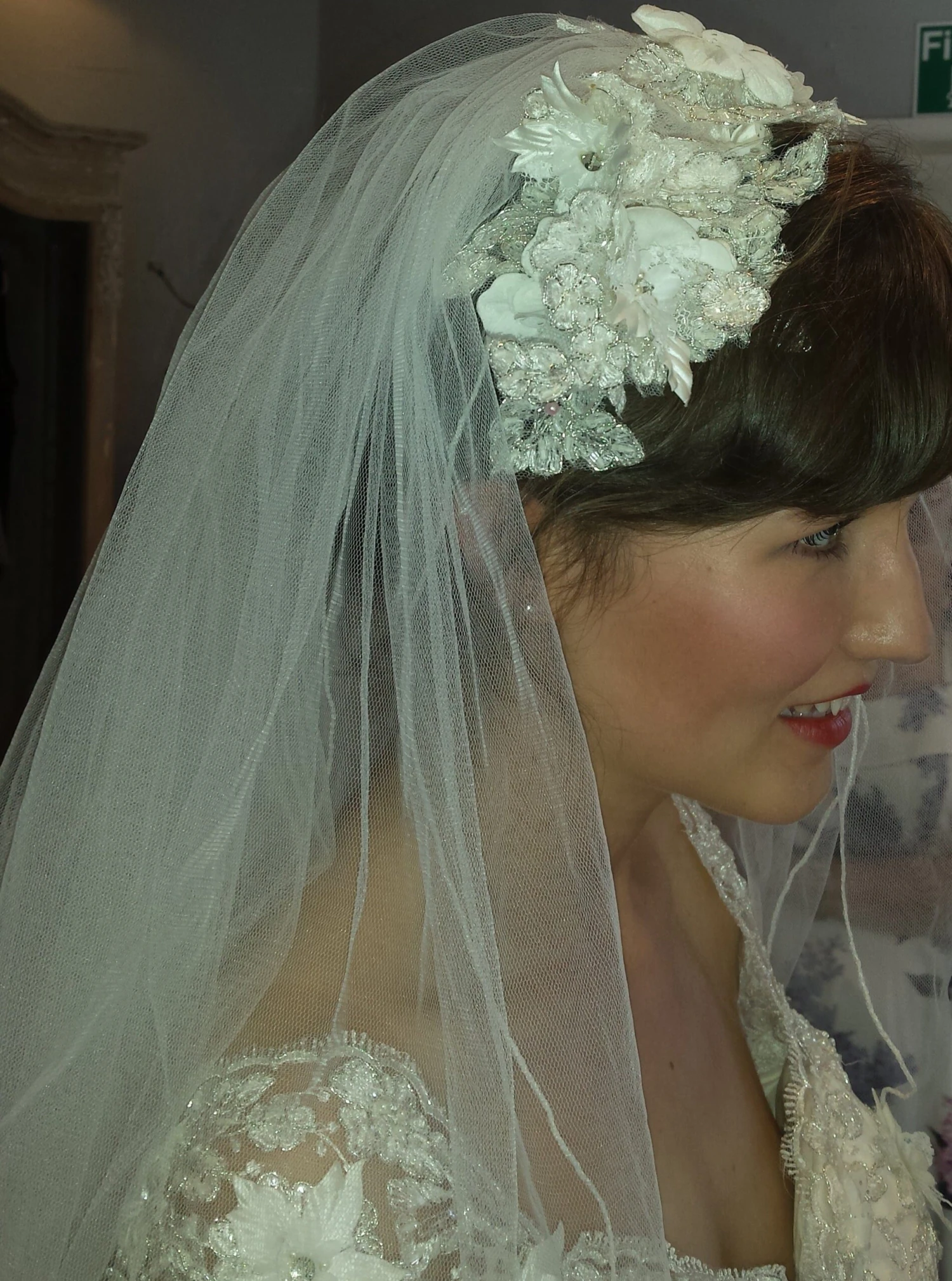 A floral bouquet which has a central feature of two raised flowers made from laser cut fabric and lace with a large diamante. The leaves are heavily embroidered, with hand sewn tubular beads, all edged with a continuous silver filigree thread. The overall effect is quite breathtaking.