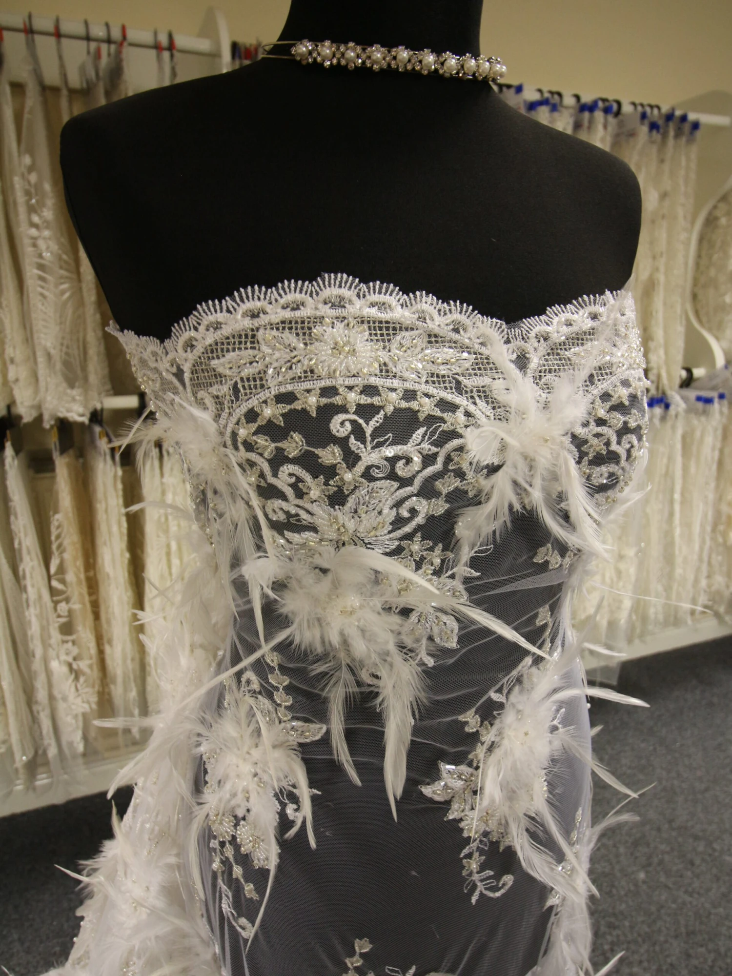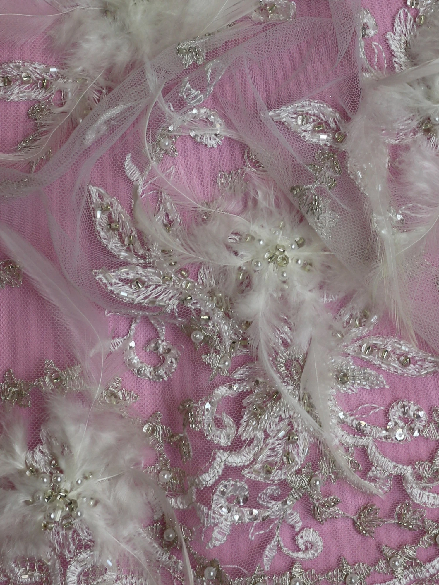 Each motif has a series of feathers radiating from the centre, which are attached using pearls and beads. The motif is further decorated with both ivory and colourless beads and gold filigree thread. The leaves of the bouquet are shaded with embroidery and embellished with sequins.