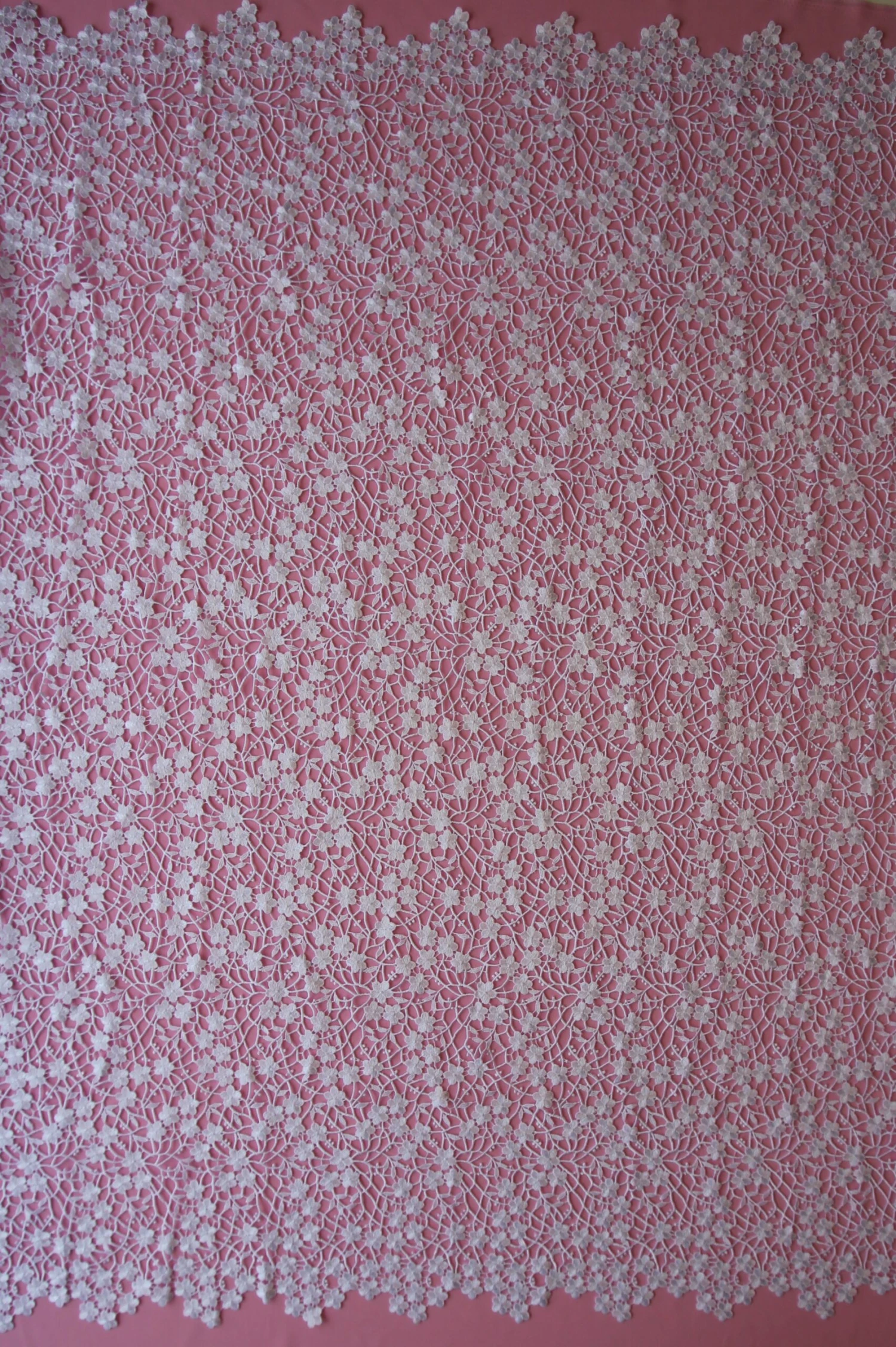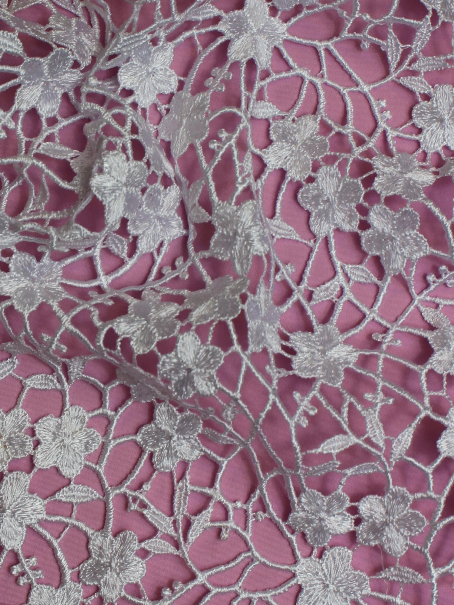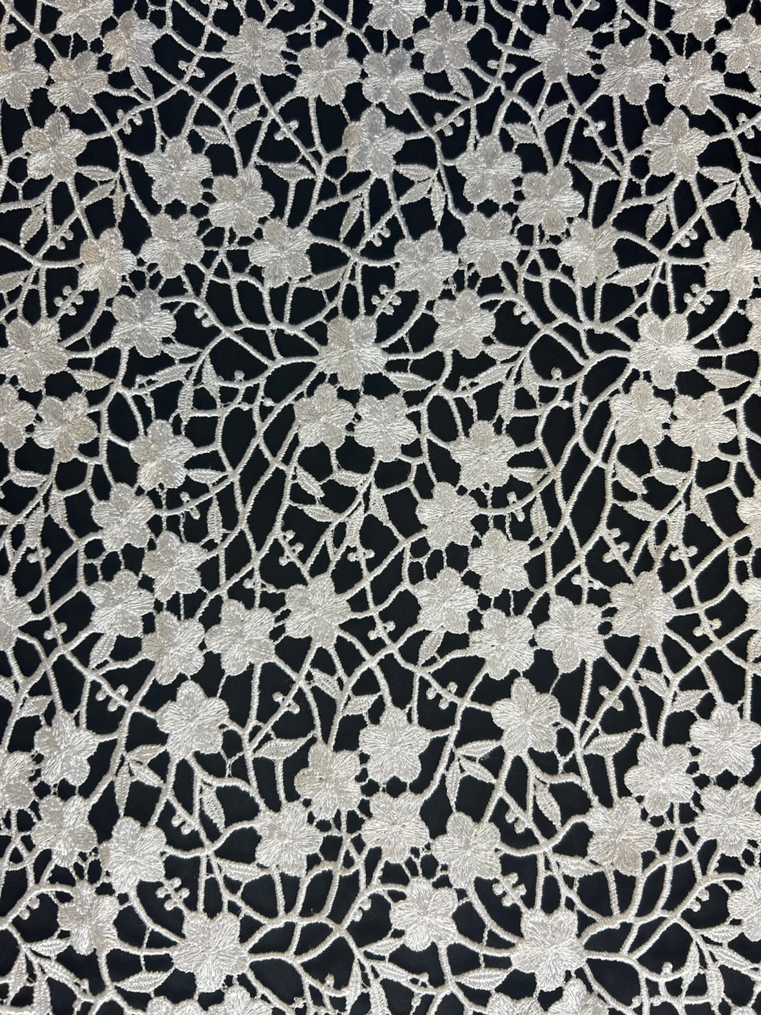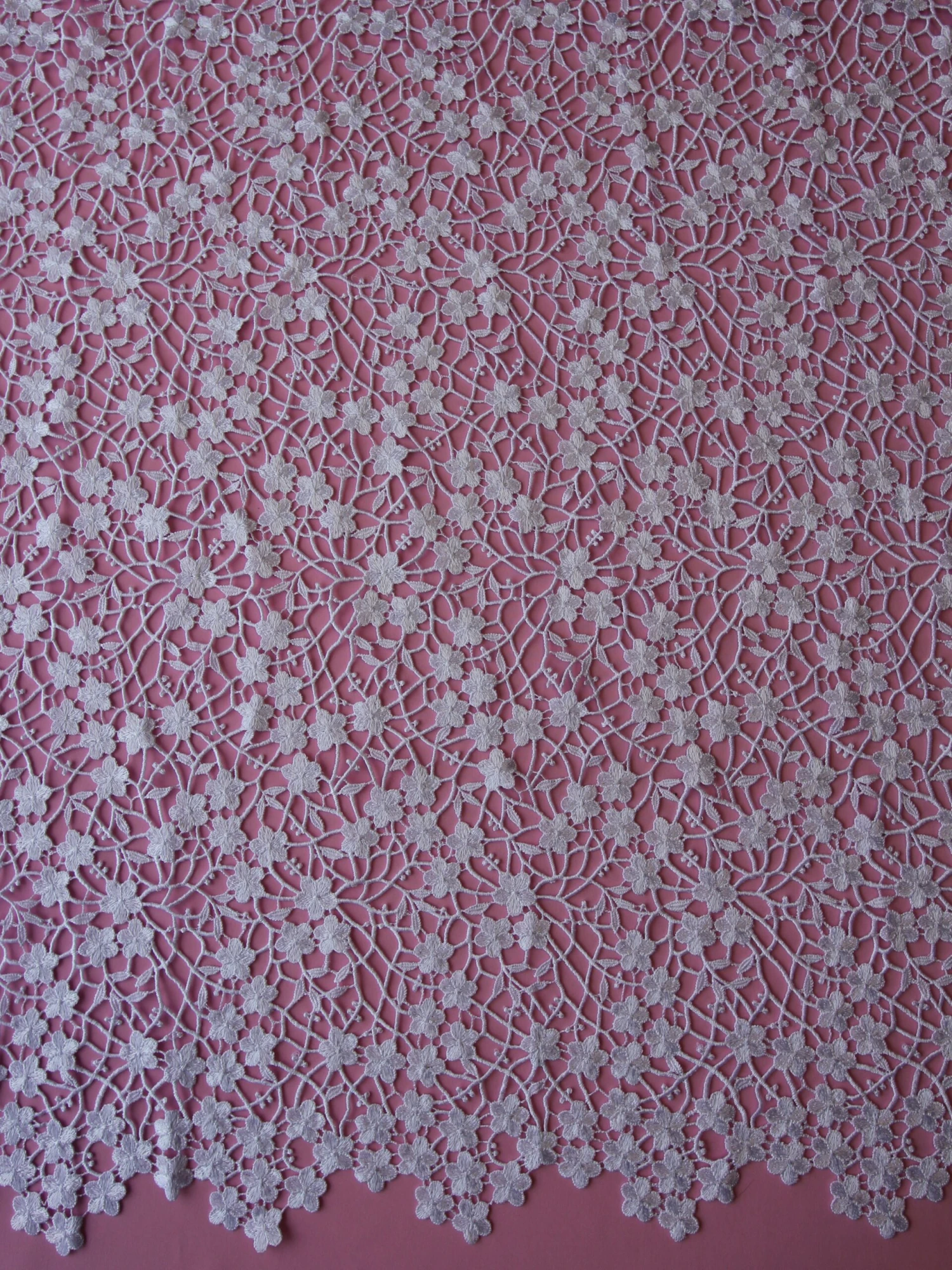 A delightful white guipure lace that measures 130 cm (51″) wide. The pattern is a relatively dense floral display with matching edges.