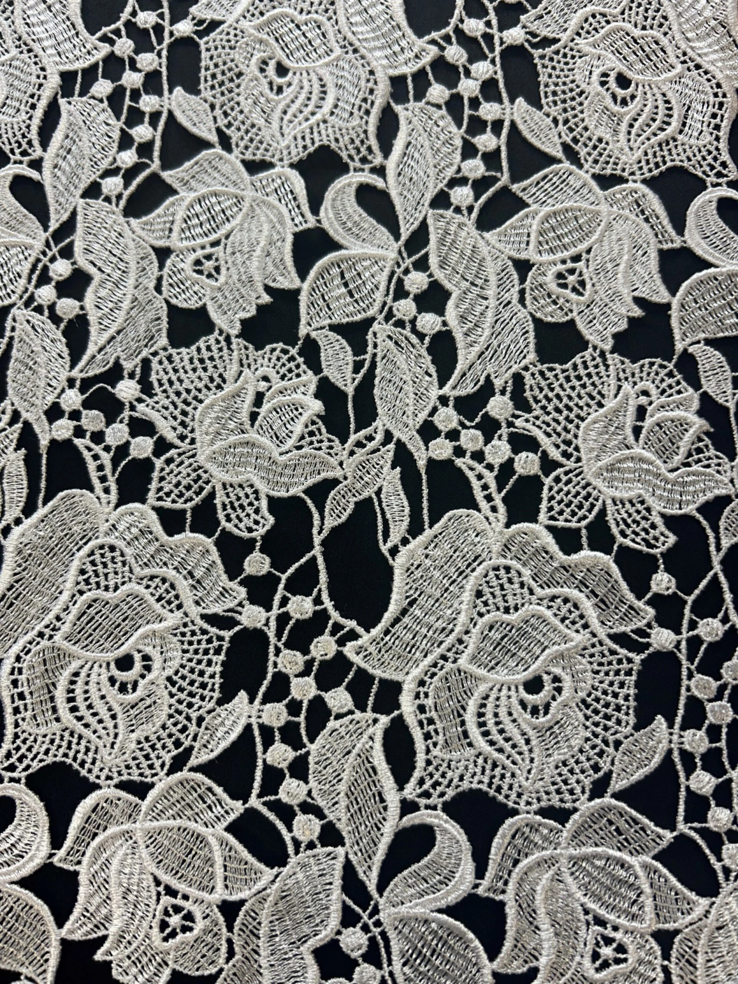 A truly stunning White Guipure lace. Large Flower buds are interspersed with smaller flower buds and leaves, which give this design an elegant balance. The identical edges are motif scalloped edges. This quality is also available in ivory and measures 97 cm (38″) wide.