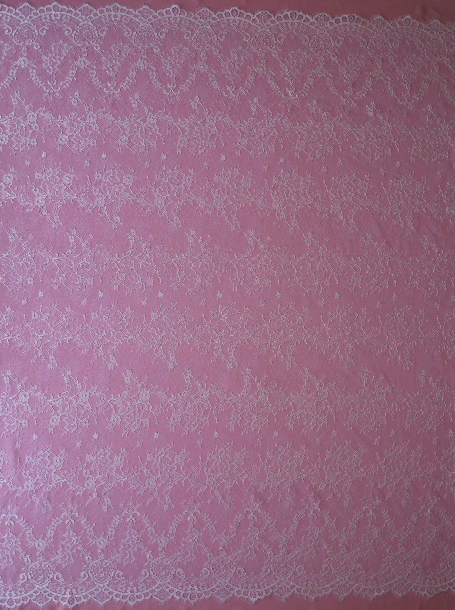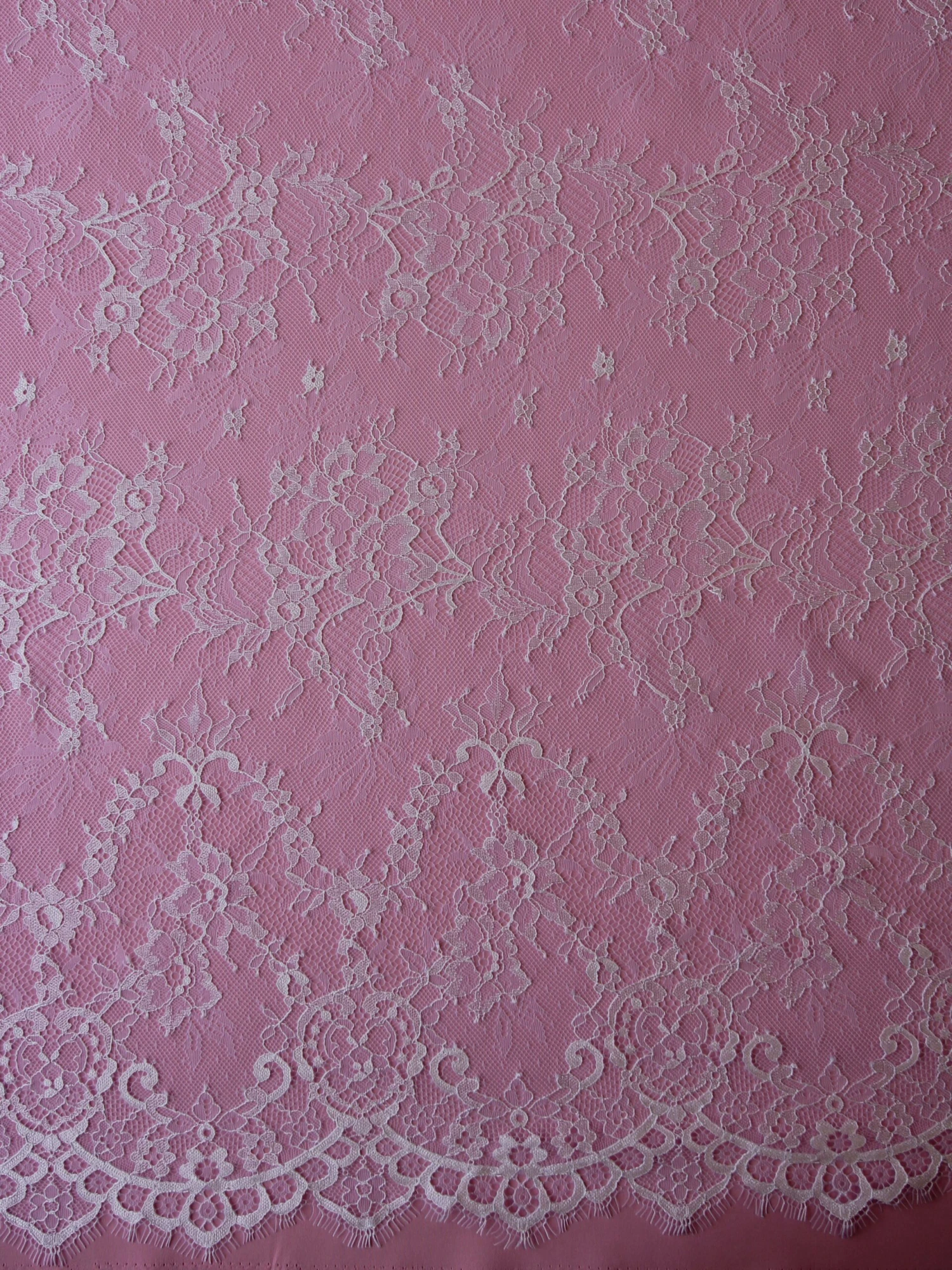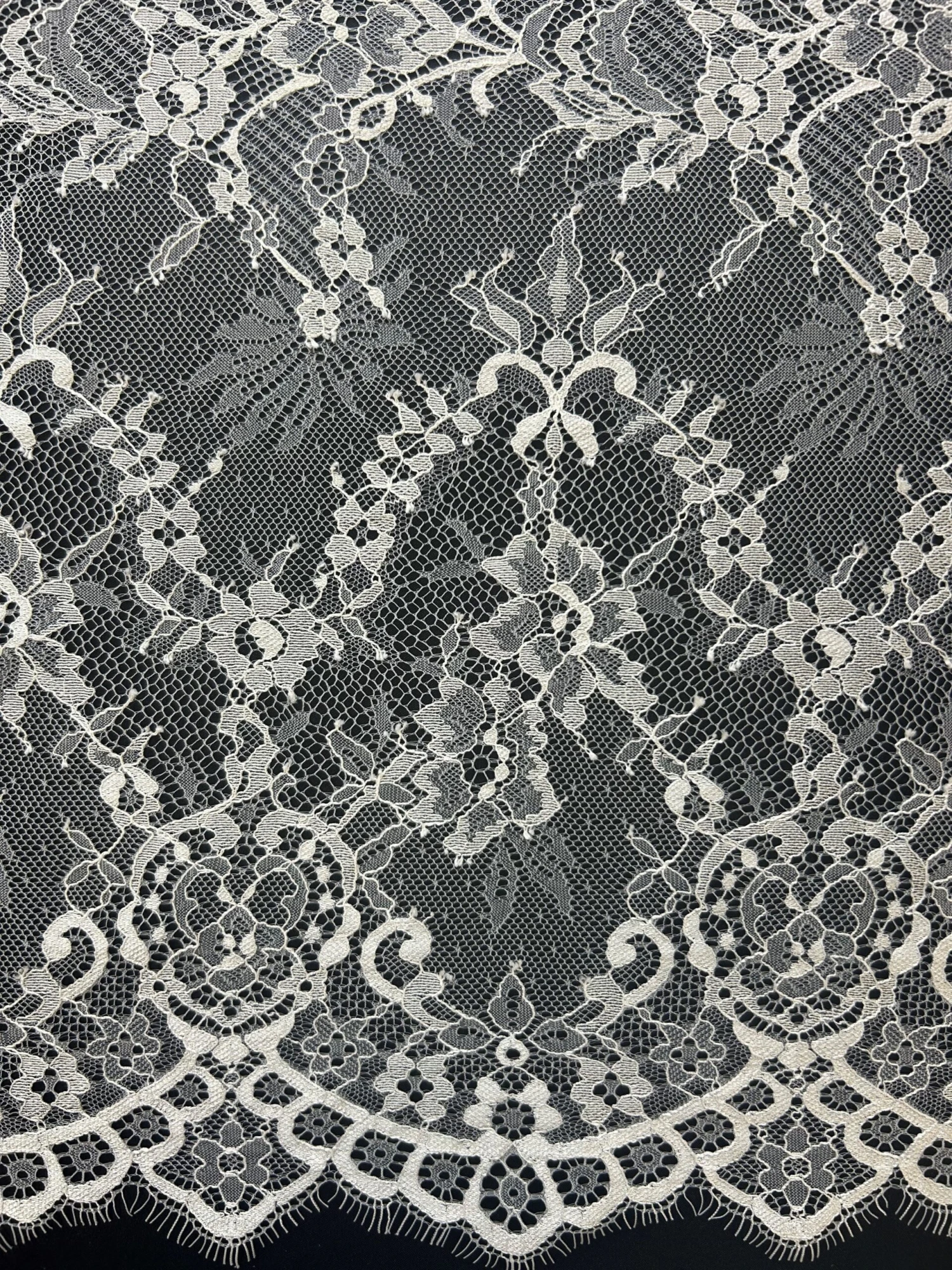 Mae is a delightful, lightweight sweeping lace with a floral design. The edges are scalloped with eyelashes or a fringe which is an extremely appealing feature.
